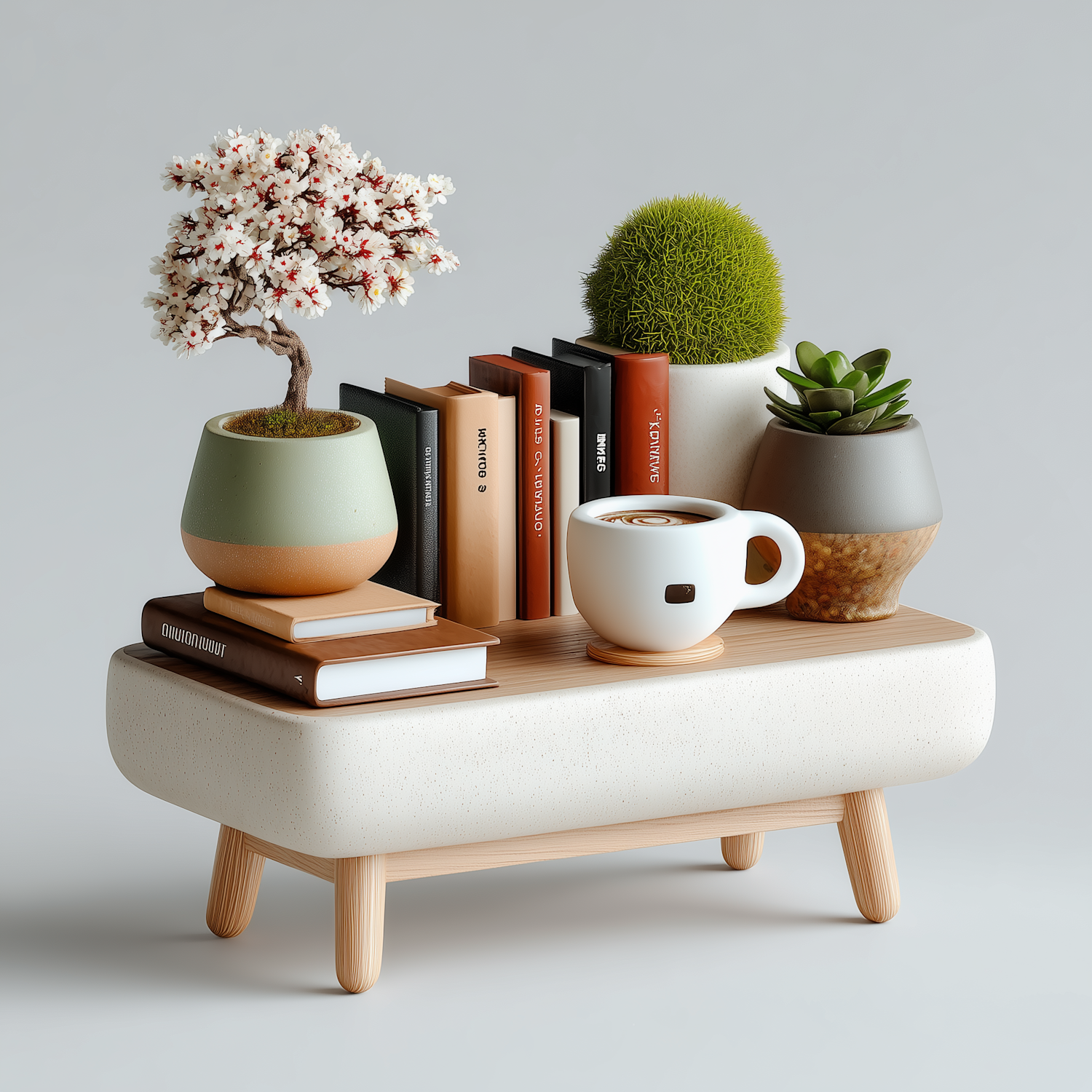 A cozy setup with books, a latte, and potted plants on a minimalist wooden table, perfect for a serene and stylish ambiance.