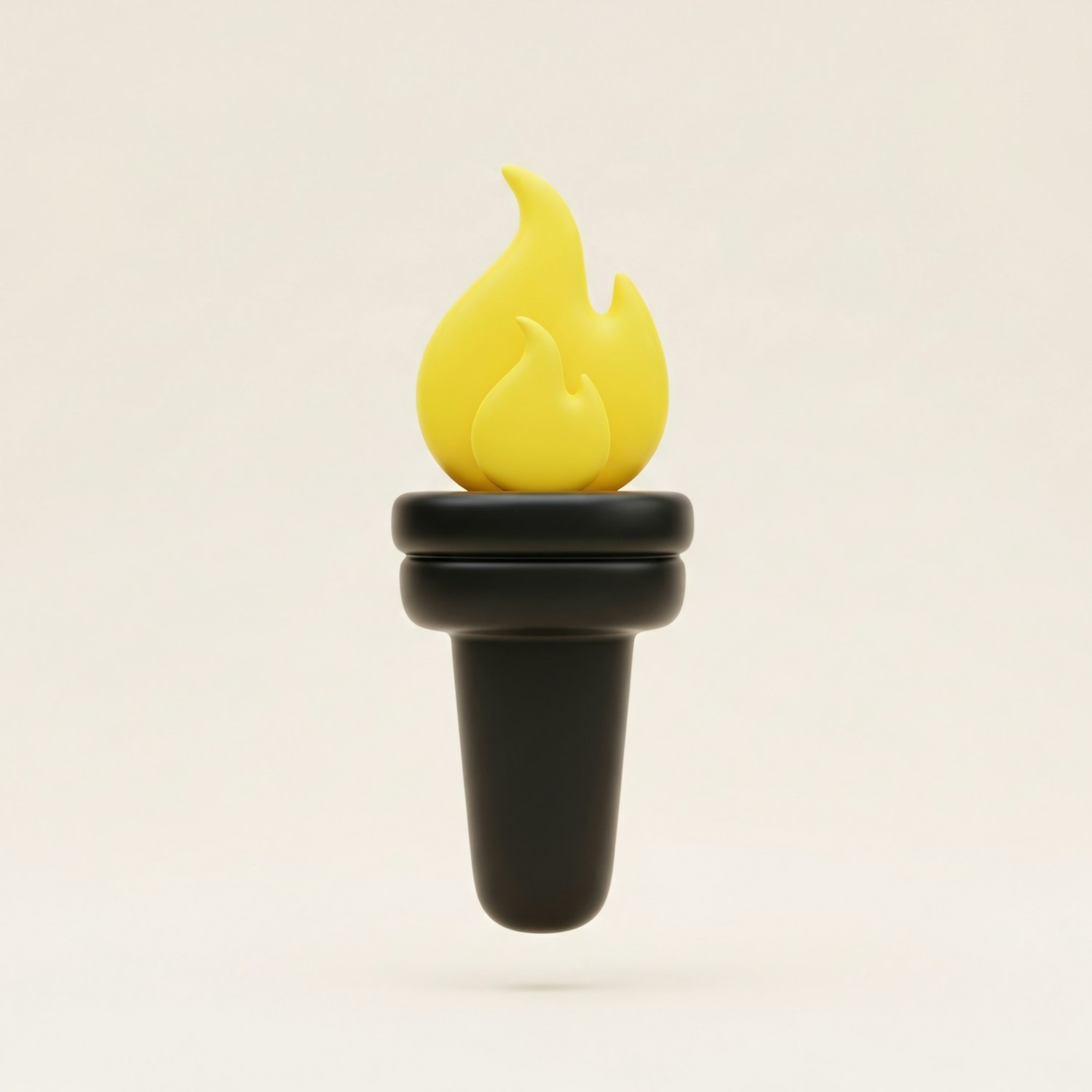 Minimalistic 3D rendering of a black torch with a bright yellow flame on a neutral background, showcasing clean and bold design.