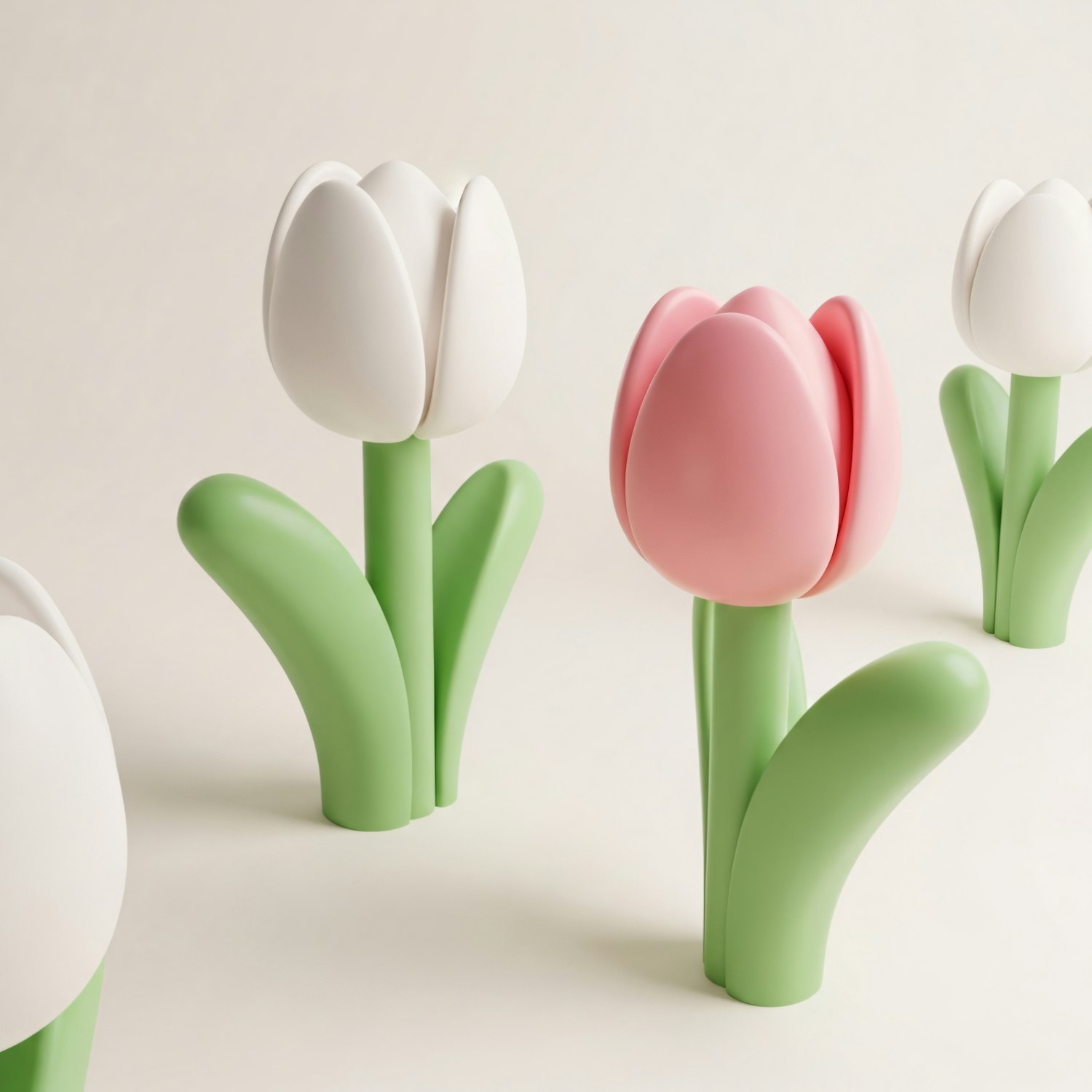 Stylized tulips in pastel colors with smooth, minimalist design, featuring white and pink petals with green stems on a neutral background.
