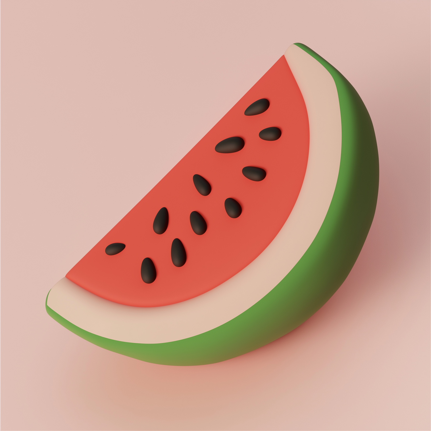 A vibrant 3D illustration of a watermelon slice with bold colors and a minimalist design on a soft pink background.