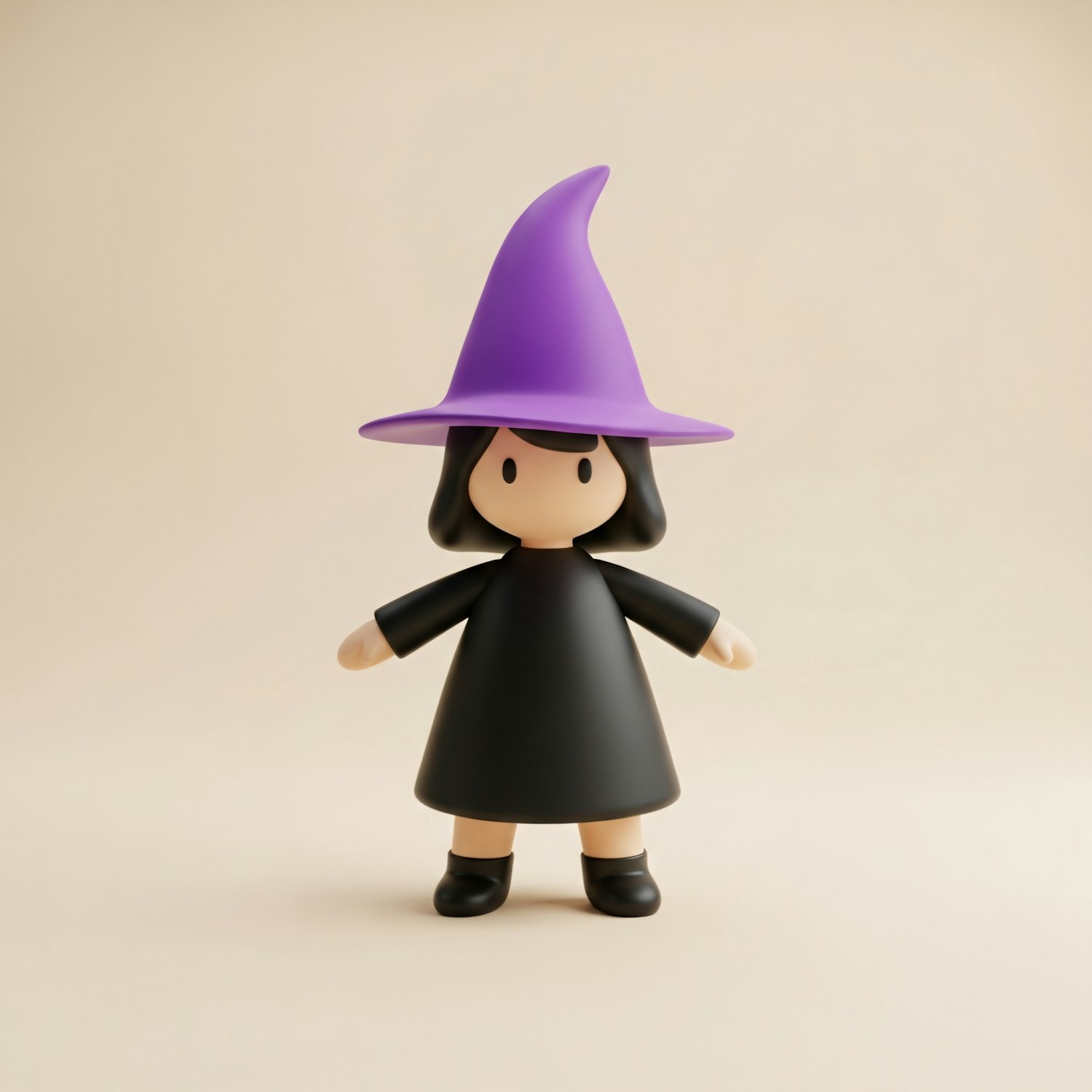 Minimalist figurine of a witch with a black dress and purple hat, set against a neutral background, perfect for Halloween decor.