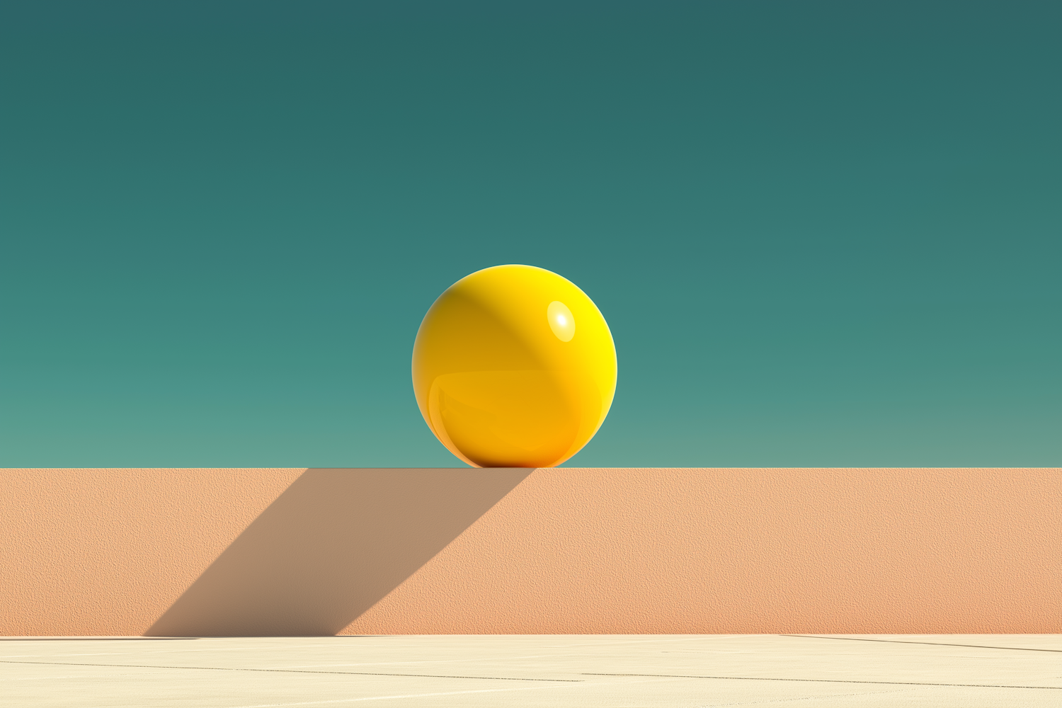A vibrant yellow sphere on a peach wall with a teal sky backdrop, creating a minimalist and modern aesthetic.