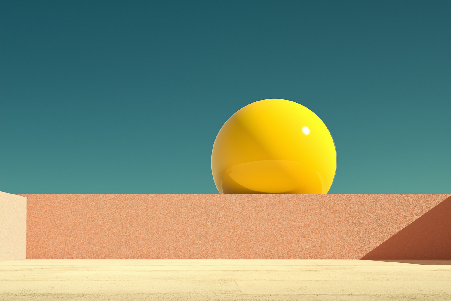 A minimalist scene with a glossy yellow sphere on a peach wall, set against a teal sky. Clean lines and bold colors create a striking visual.