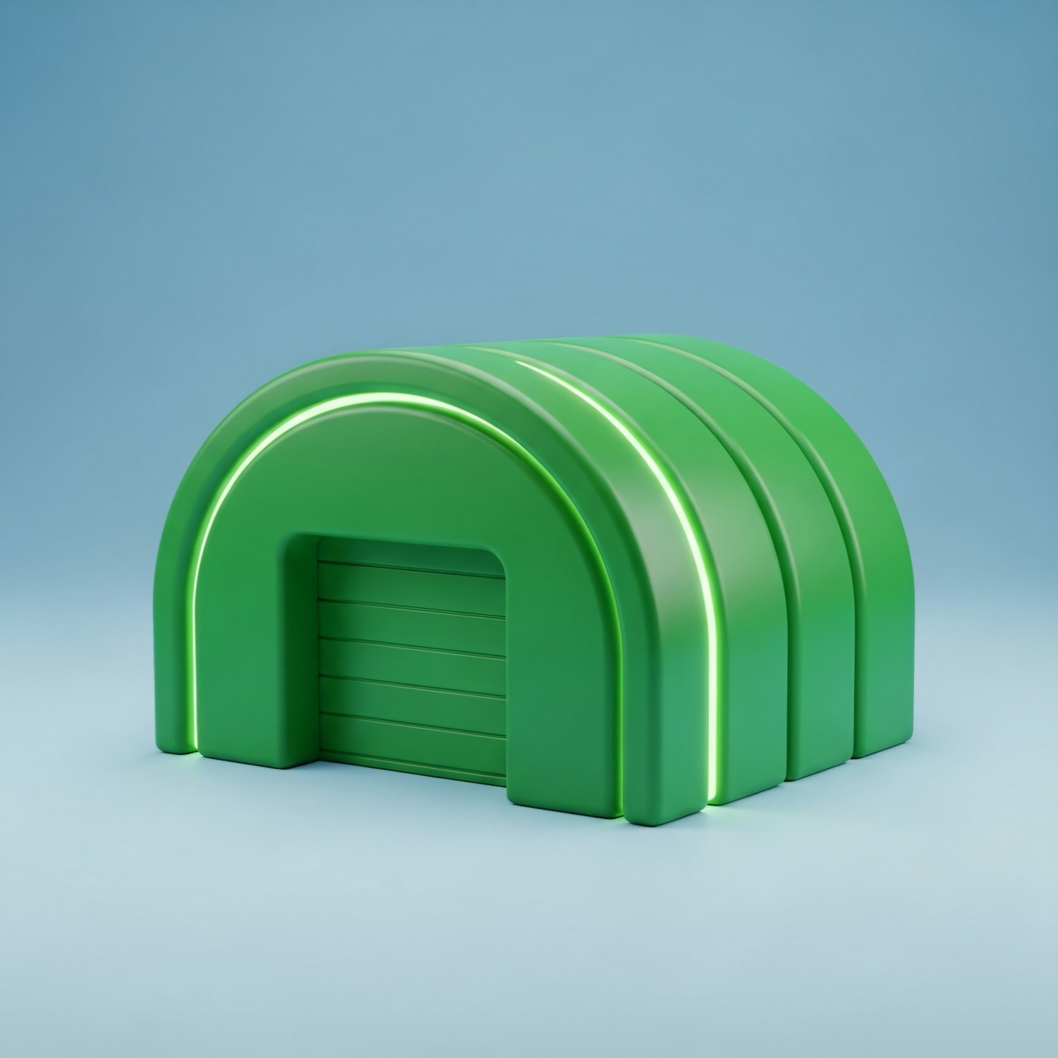 A sleek green 3D-rendered arch-shaped structure with a closed door, set against a clean light blue background.