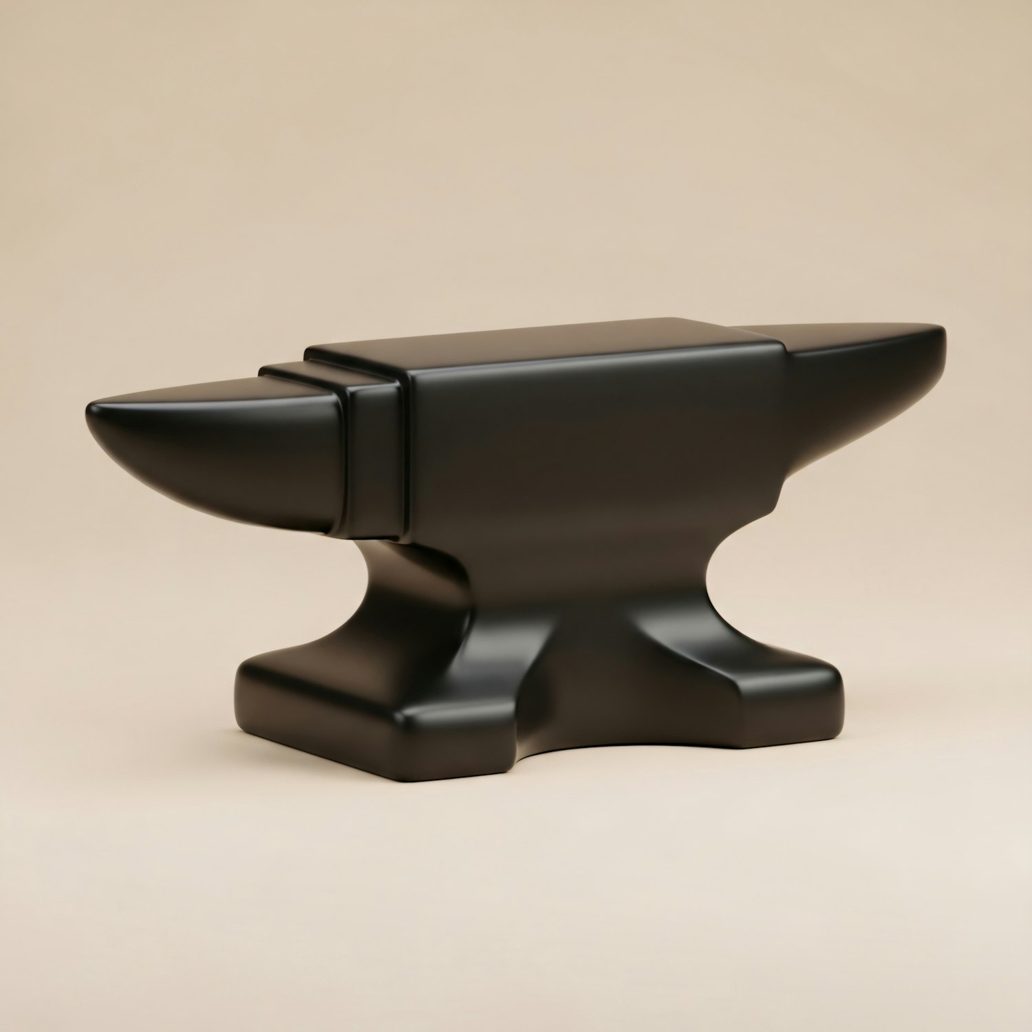 A modern black anvil with a sleek, polished design against a neutral beige background, showcasing its smooth and minimalistic aesthetic.