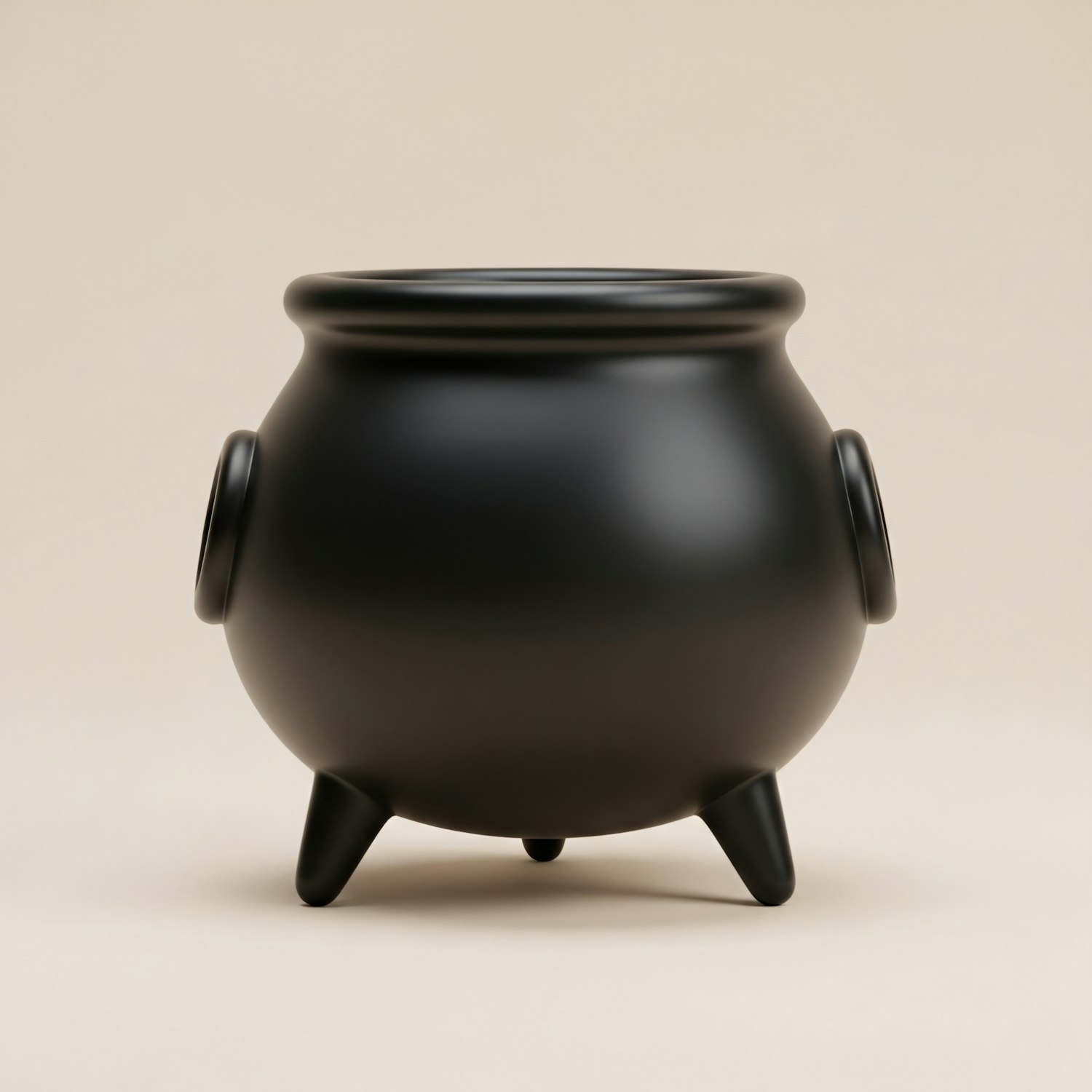 A modern black cauldron with a matte finish and minimalist design, featuring smooth curves and a neutral beige background.