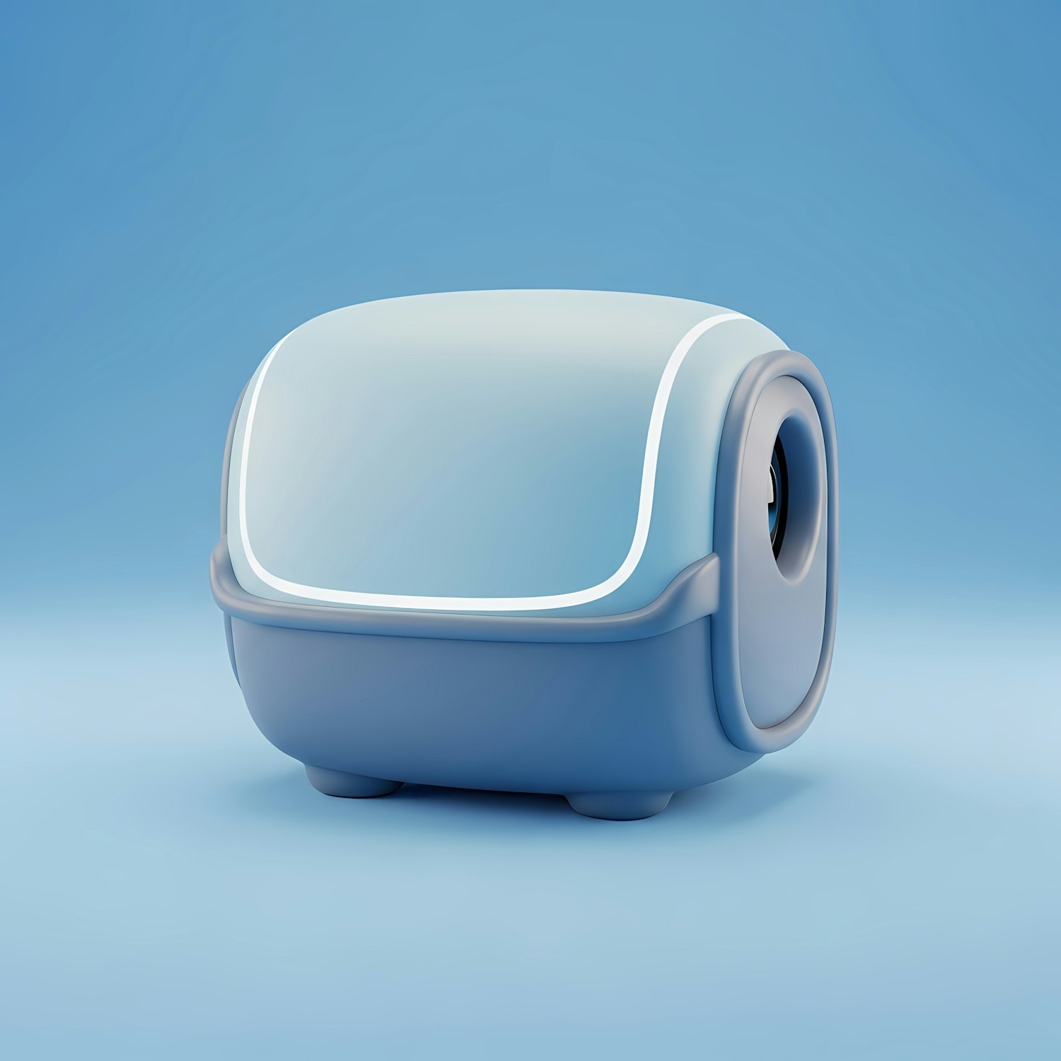 A modern, cube-shaped blue device with a sleek design and rounded edges, set against a gradient blue background.