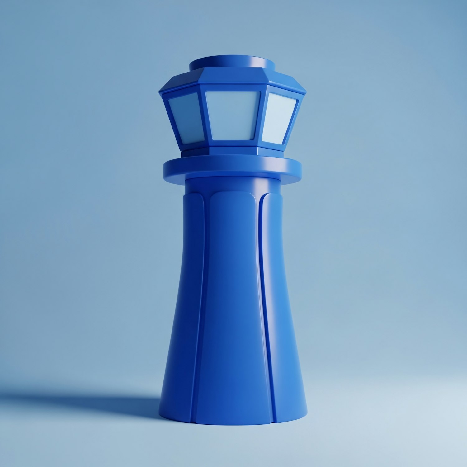 A modern, blue lighthouse design with clean lines and a glossy finish, set against a matching blue background for a minimalist look.