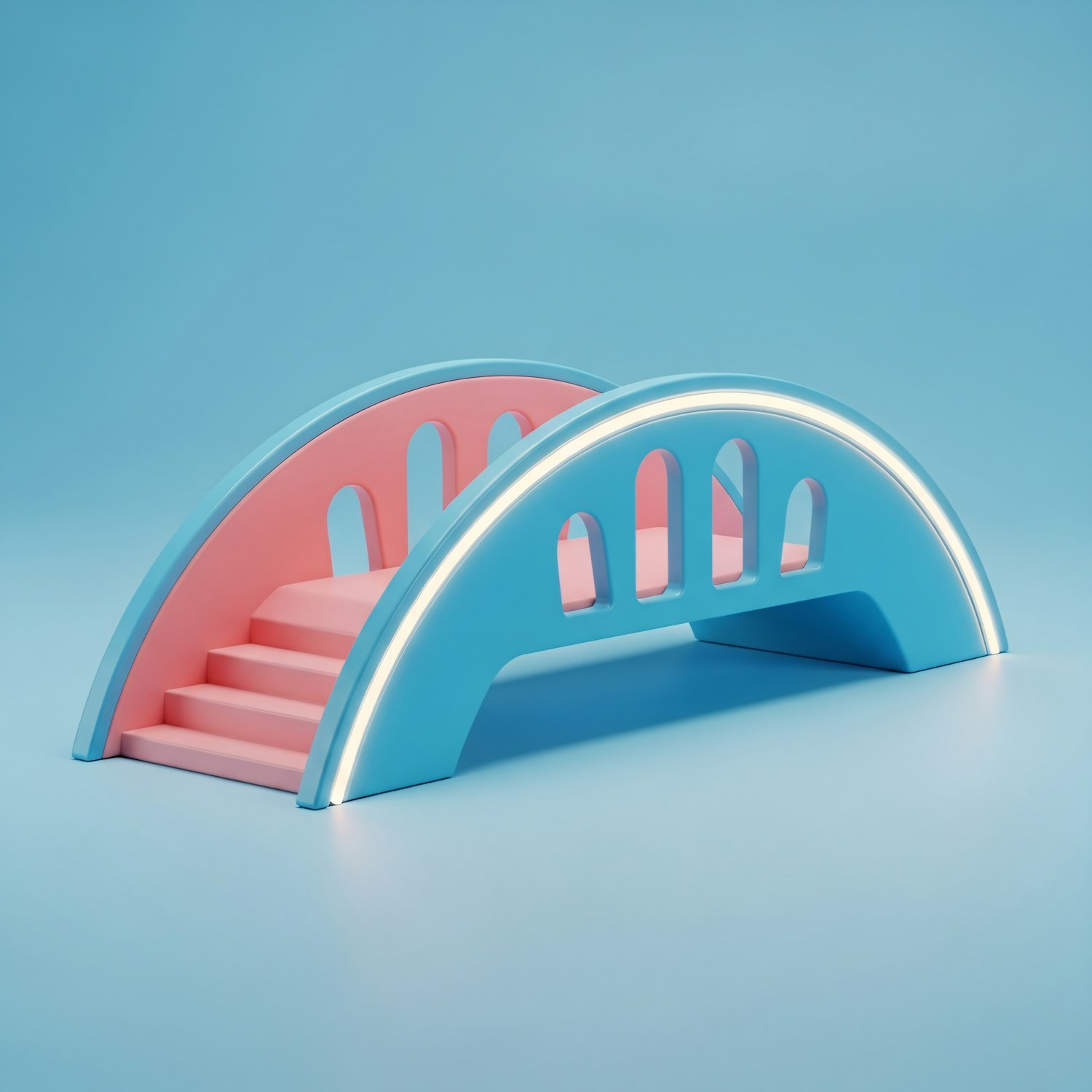 A modern, colorful bridge design with pink and blue tones, featuring glowing accents and a clean, minimalistic background.