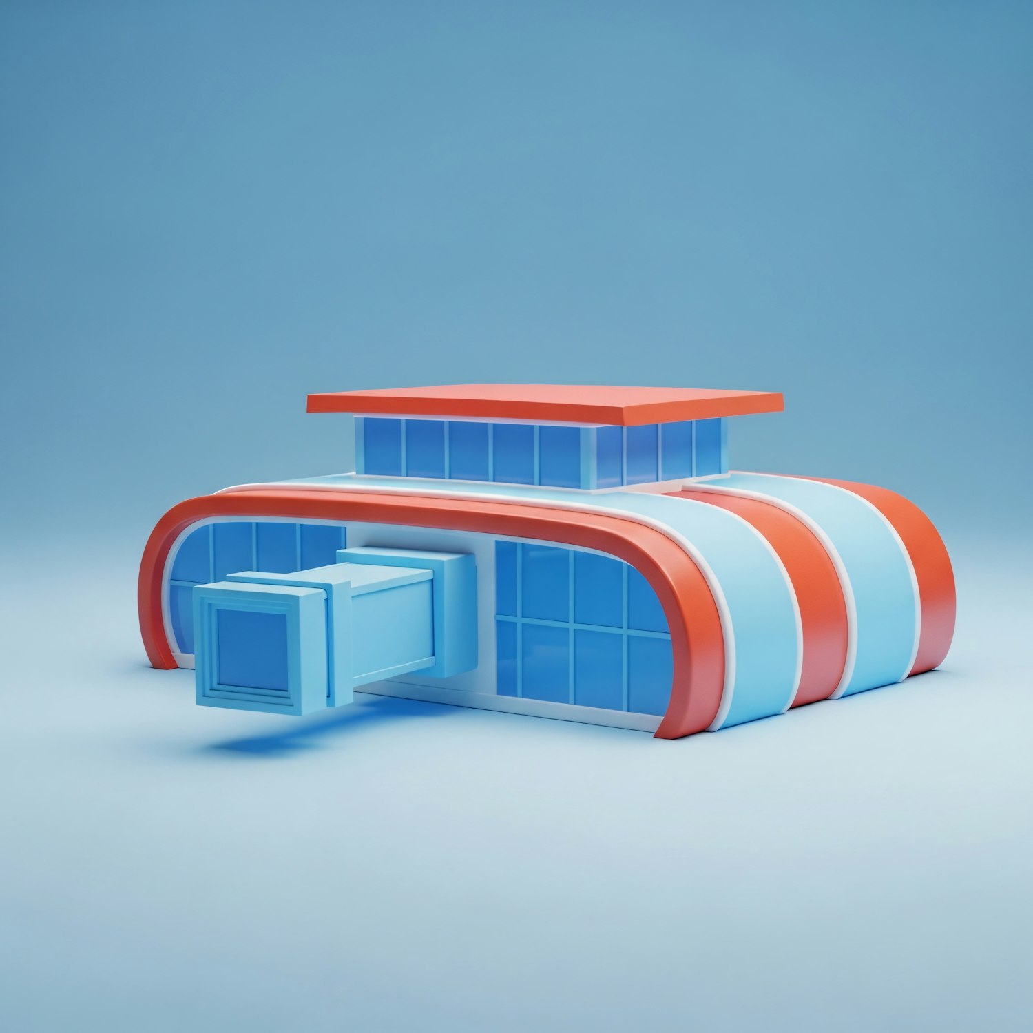 A colorful 3D model of a modern building with red and blue accents, featuring large windows and a unique geometric design.