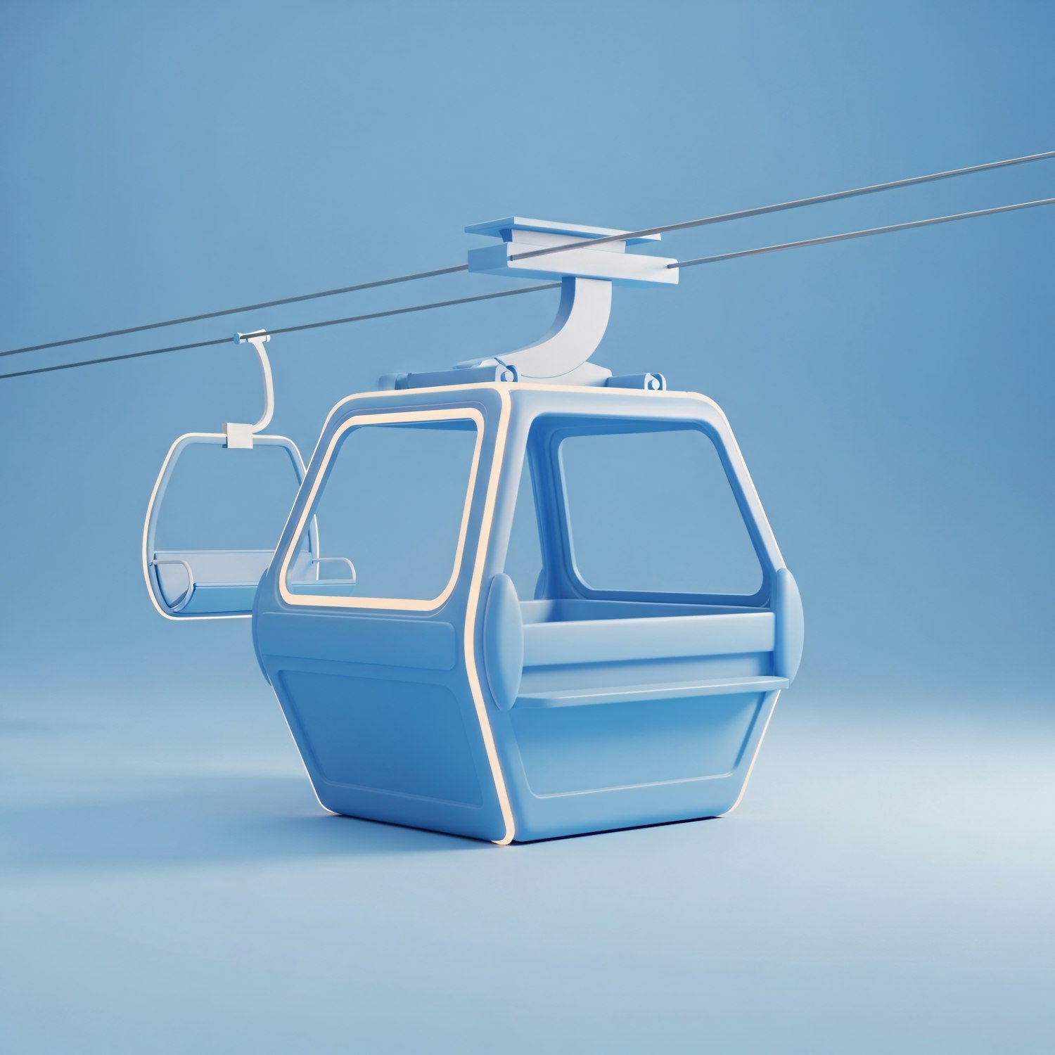 Stylized 3D-rendered cable car gondola in light blue with white accents, set against a serene blue gradient background.