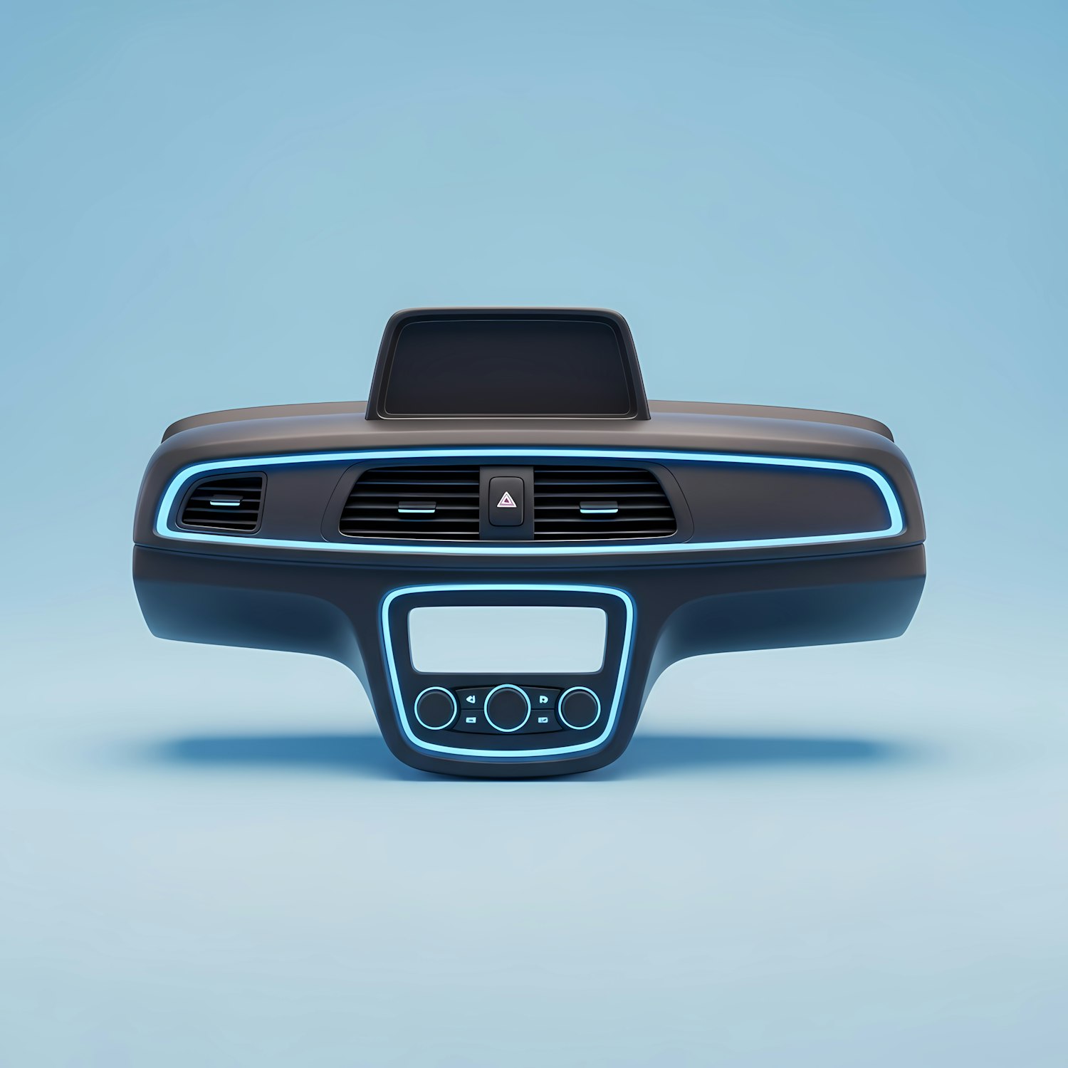Sleek car dashboard with blue accent lighting, central display, and modern controls, set against a light blue background.