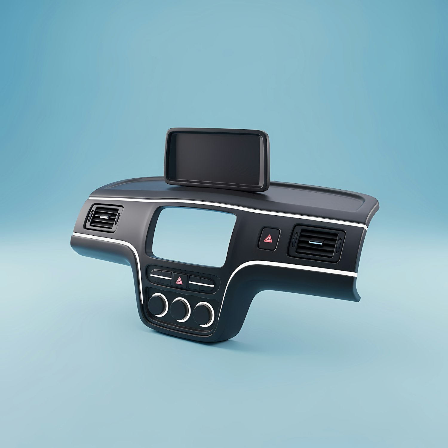 Sleek car dashboard with a central screen, rotary knobs, and air vents, set against a light blue background for a modern look.