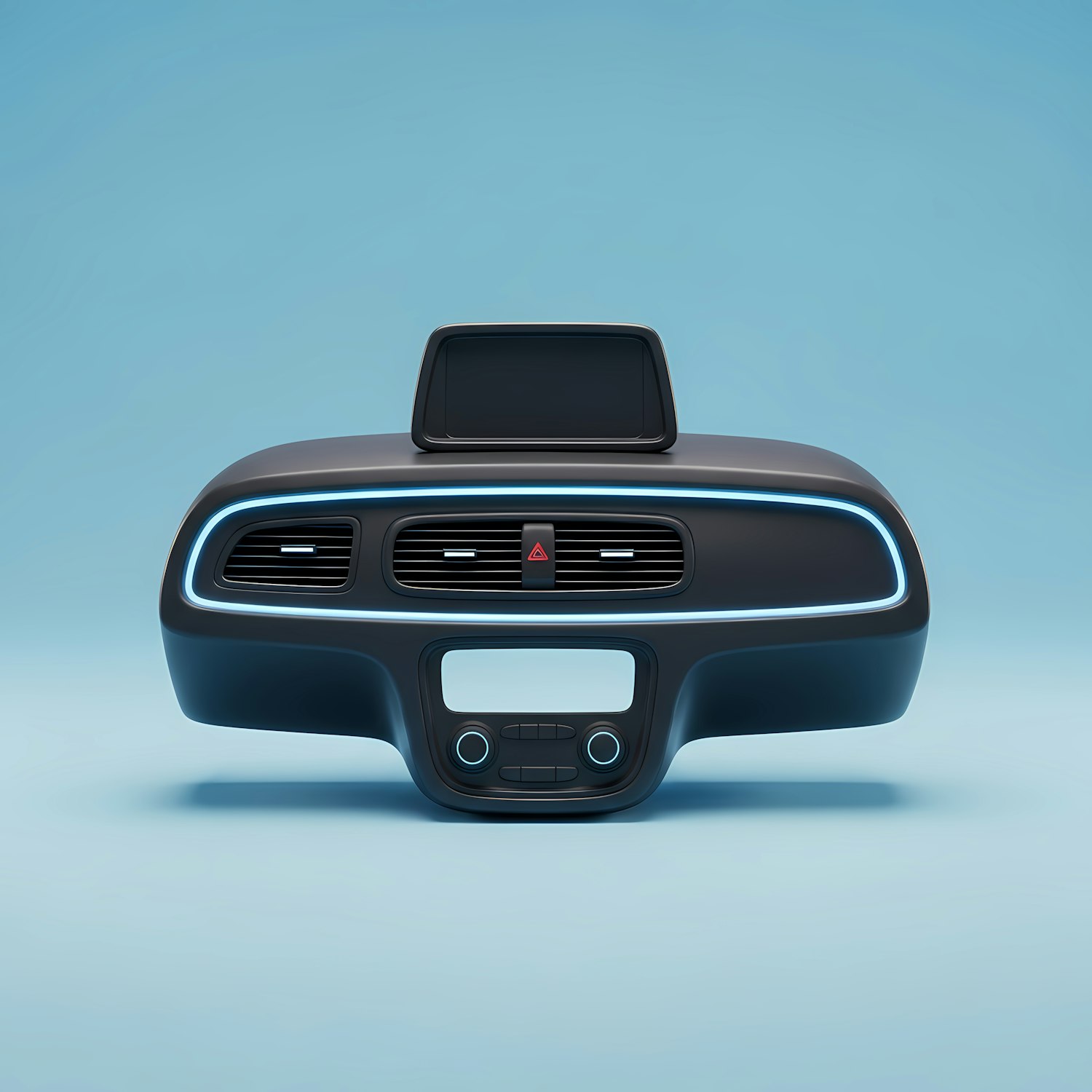 Sleek car dashboard with a central screen, air vents, and controls, highlighted by a glowing blue accent on a light blue backdrop.