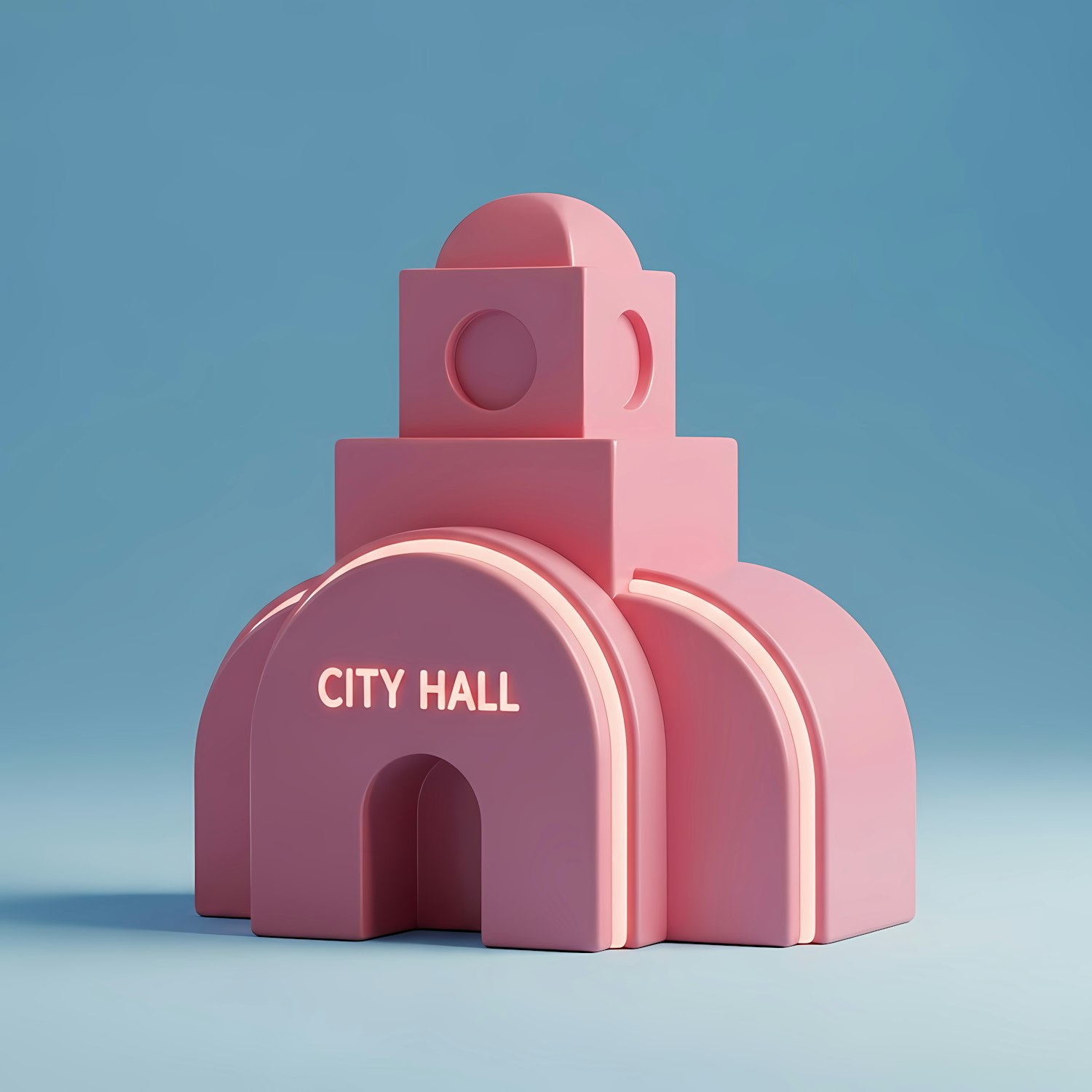 A pastel pink 3D city hall model with smooth, rounded shapes against a light blue background, showcasing minimalist design.