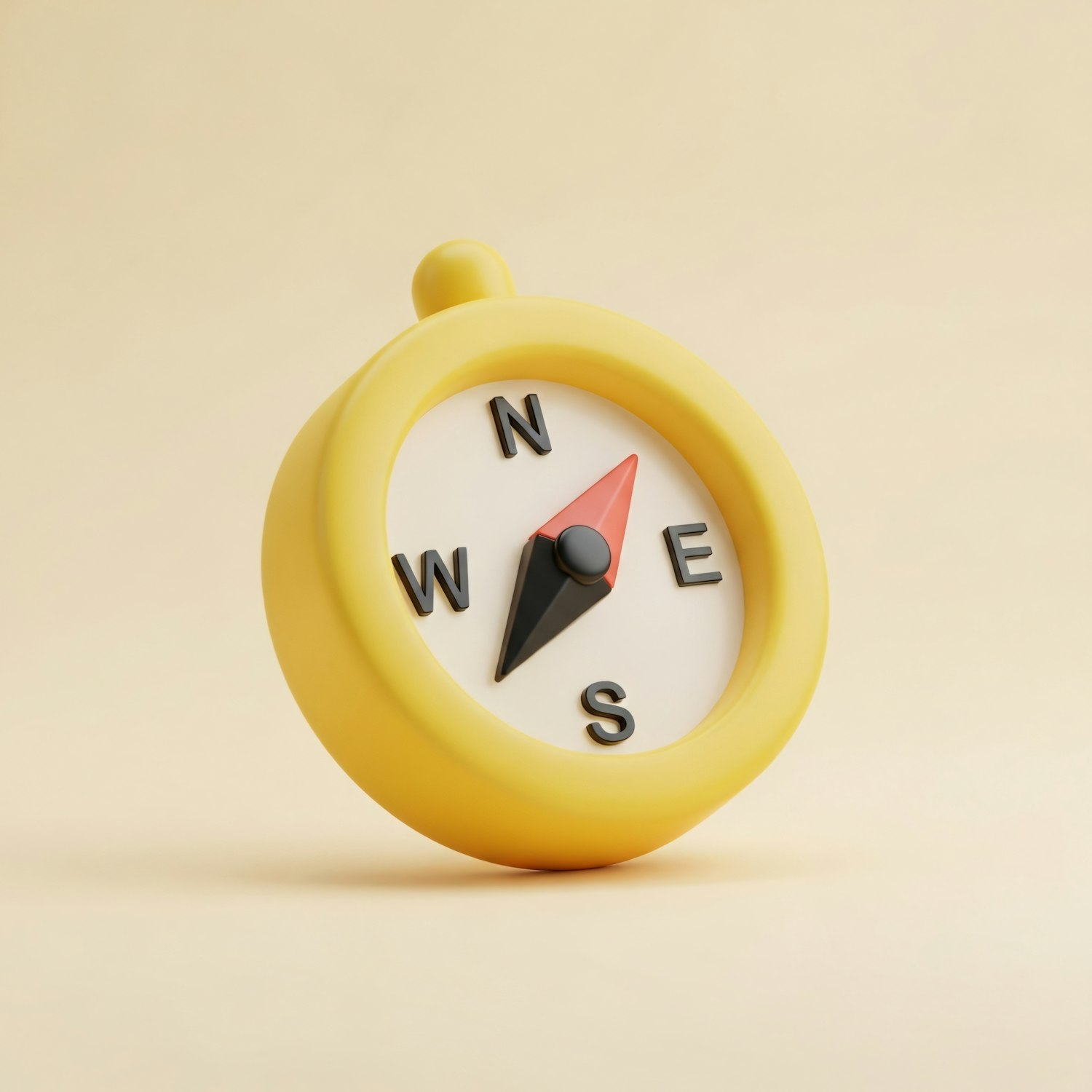 A modern, minimalistic compass with a yellow casing and bold cardinal directions on a beige background.