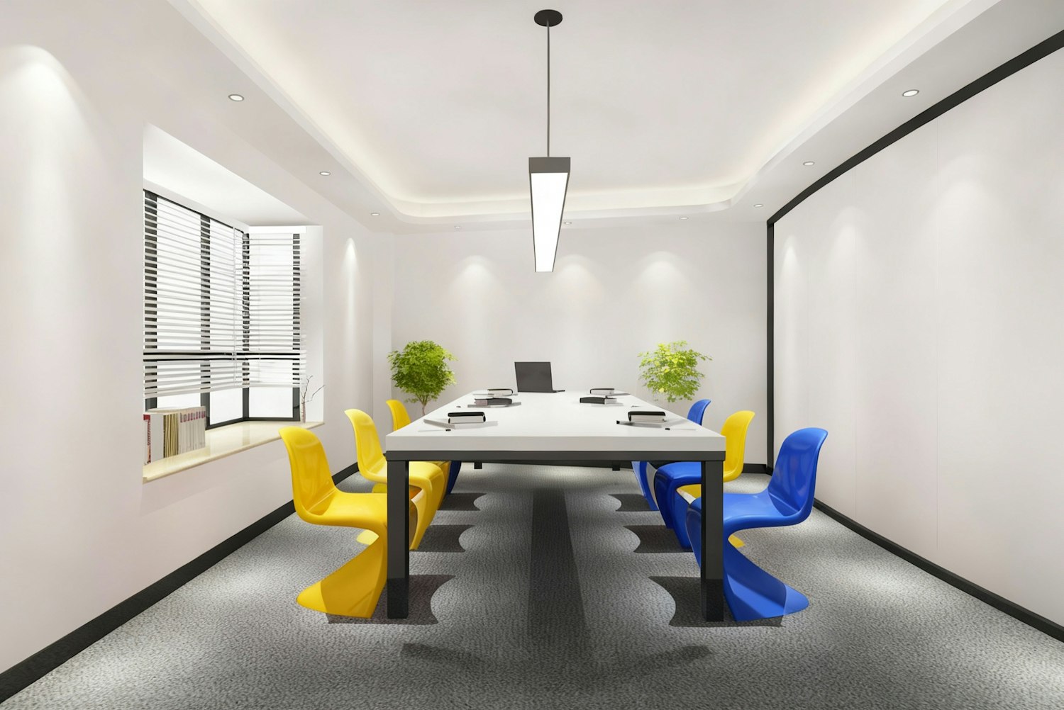 A modern conference room with a white table, colorful chairs, and natural light, creating a vibrant and professional atmosphere.
