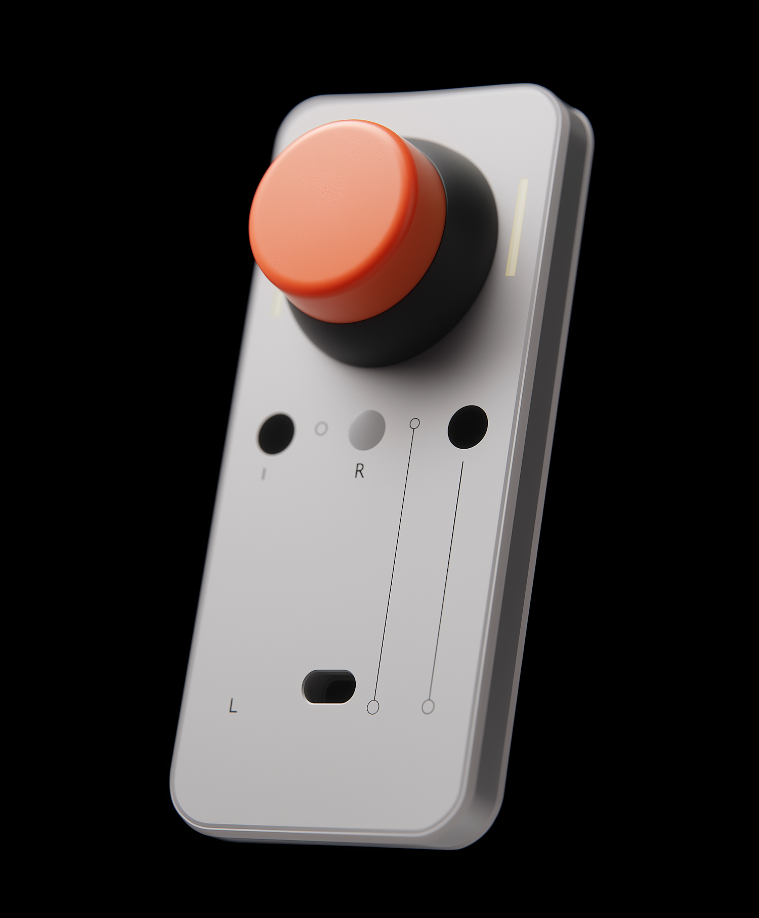 Minimalist control device with a bold orange knob, sleek gray body, and functional markings on a black background.