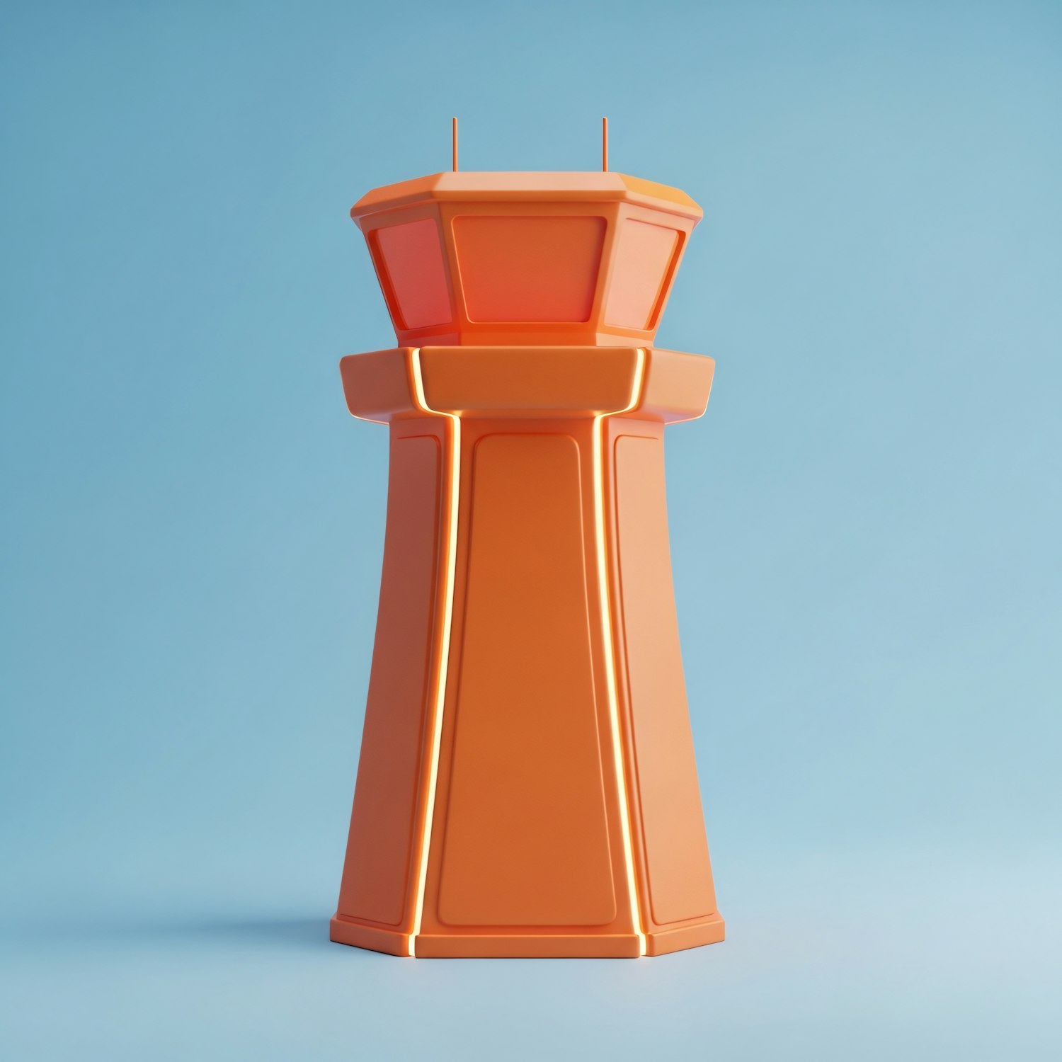 A vibrant orange control tower with a modern design stands against a light blue background, showcasing a clean and minimalistic aesthetic.