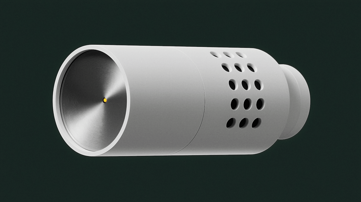 A sleek, cylindrical metallic object with perforations and a reflective surface, set against a dark background.