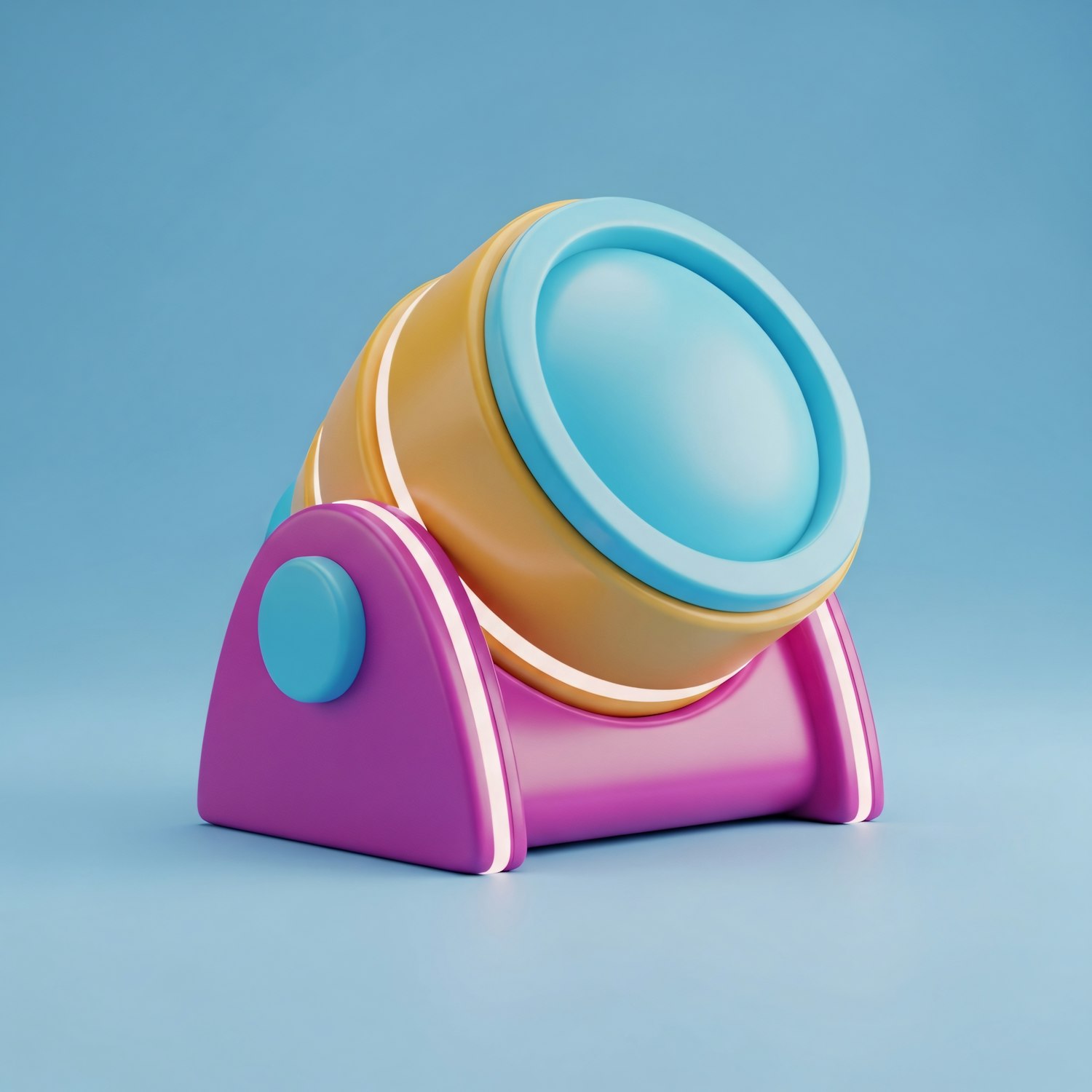 A vibrant 3D-rendered object with a colorful design, featuring a blue and yellow cylindrical form on a pink base, set against a light blue background.