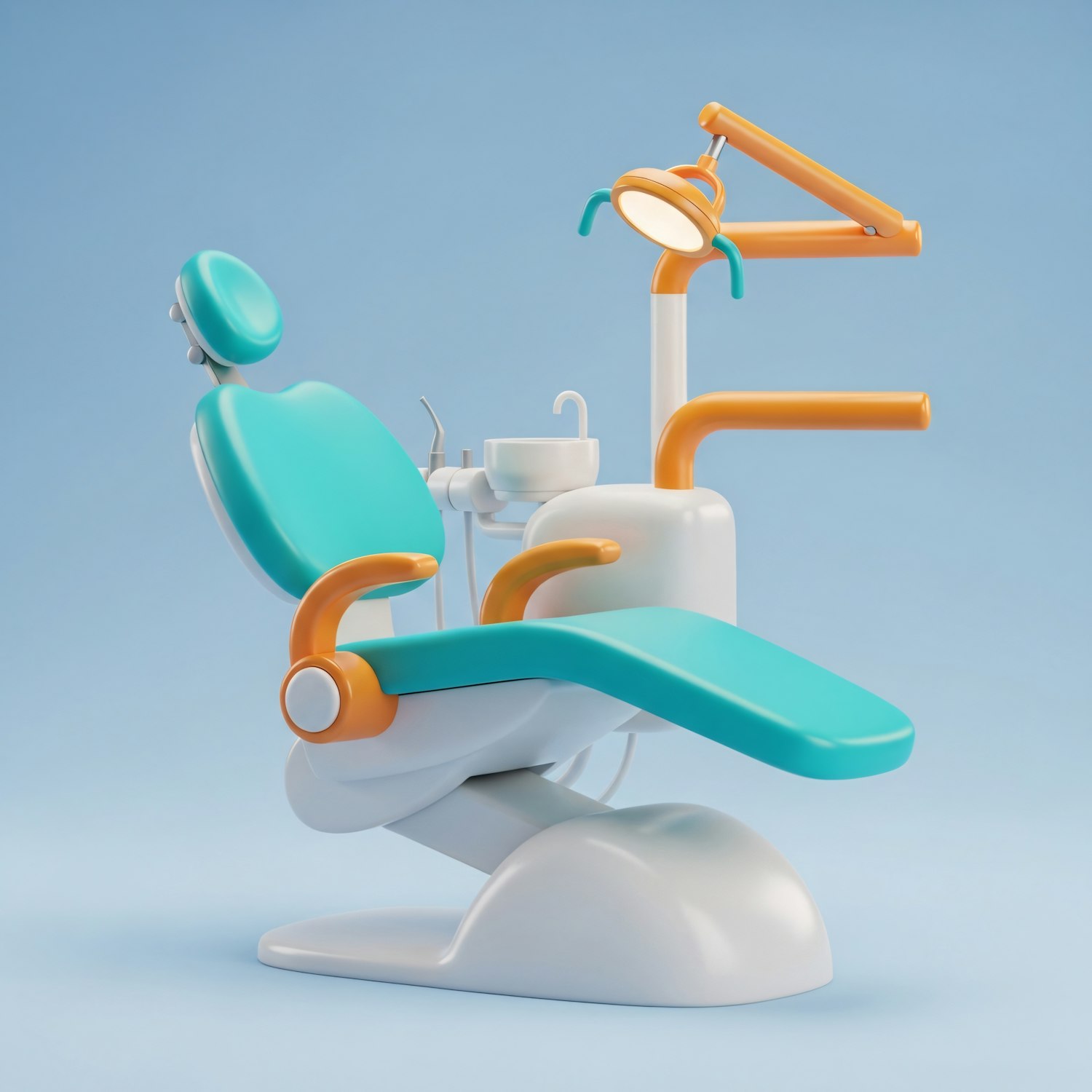 A 3D-rendered dental chair with turquoise and orange accents, featuring a modern design and a clean, minimalistic background.