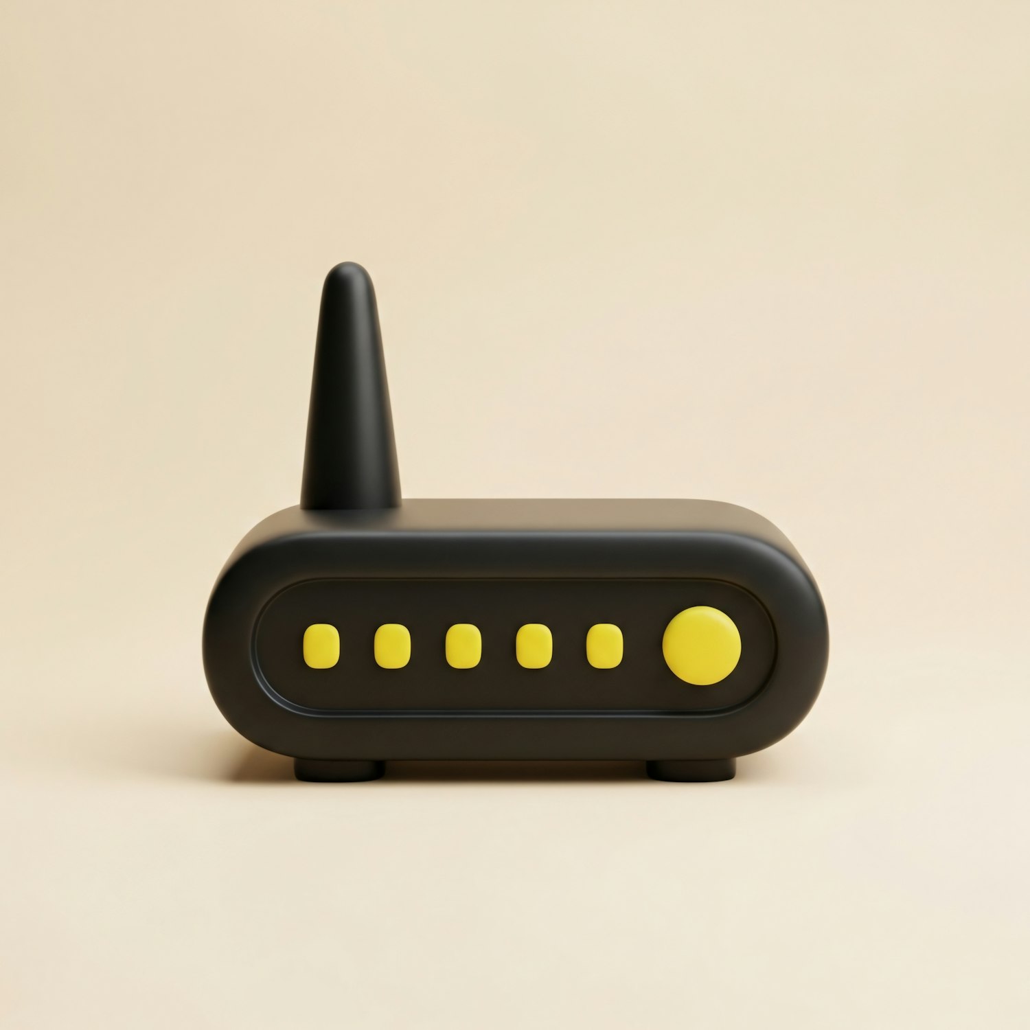 A modern black device with yellow buttons and a sleek design, set against a neutral beige background for a minimalist aesthetic.