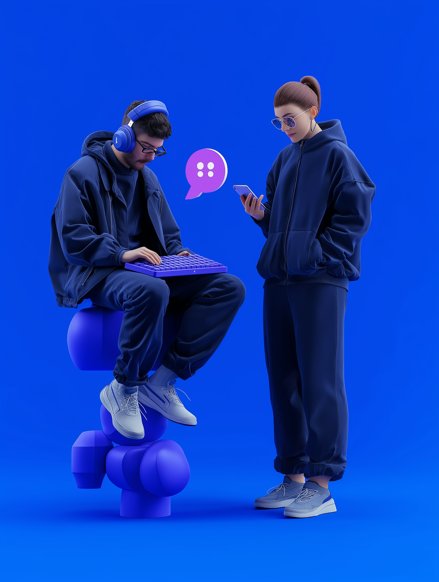 Stylized 3D characters in blue hoodies, one typing on a keyboard, the other on a phone, with a speech bubble, set against a blue background.