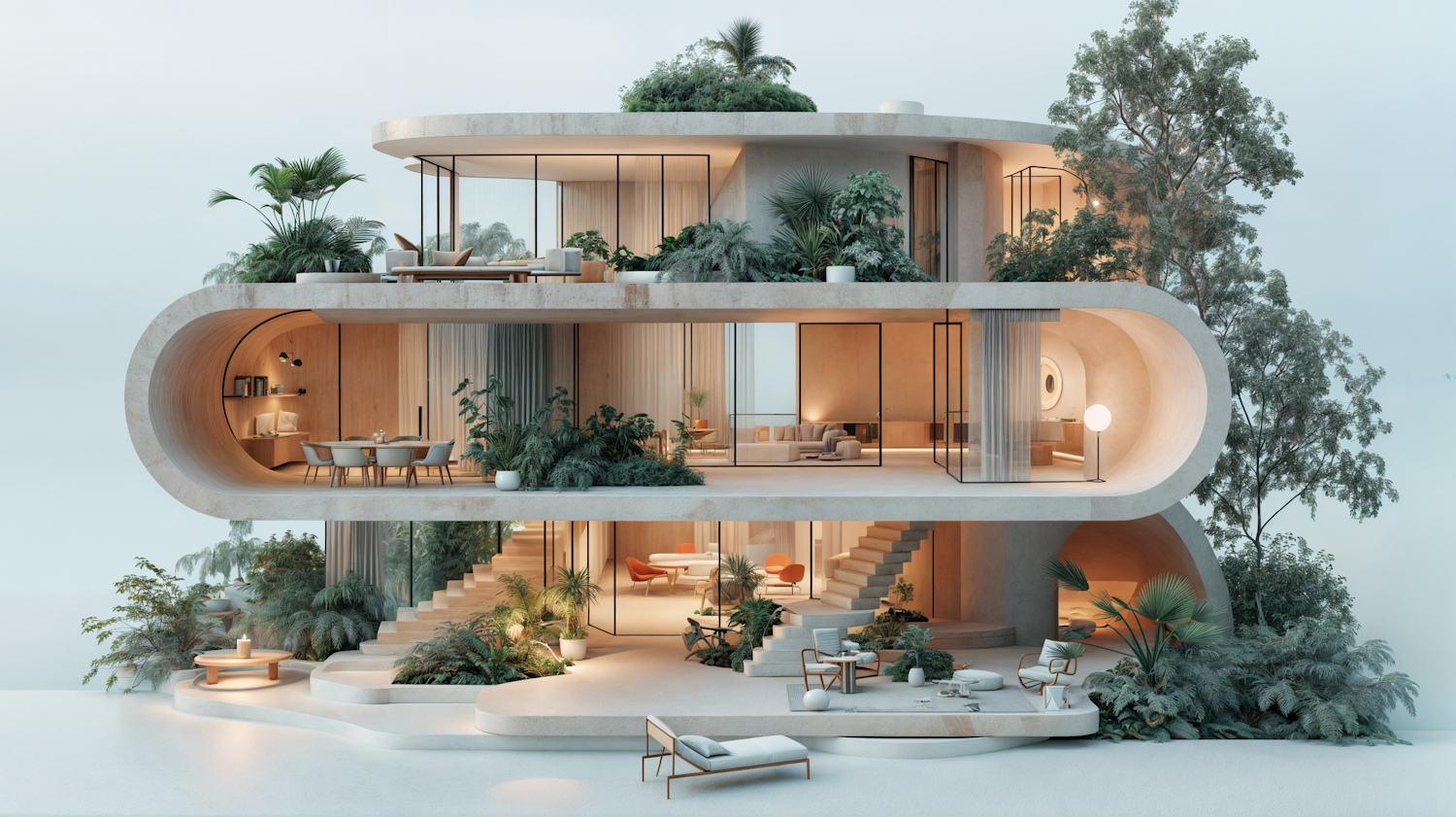 Stunning modern house with lush greenery, rounded architecture, and minimalist design. Features open-plan layout and elegant outdoor spaces.