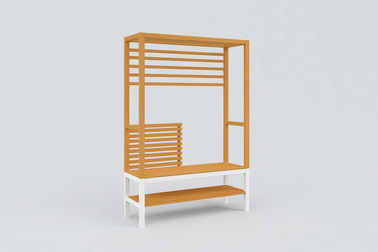 Minimalist wooden and white metal furniture with open shelving and a modern design, perfect for contemporary spaces.