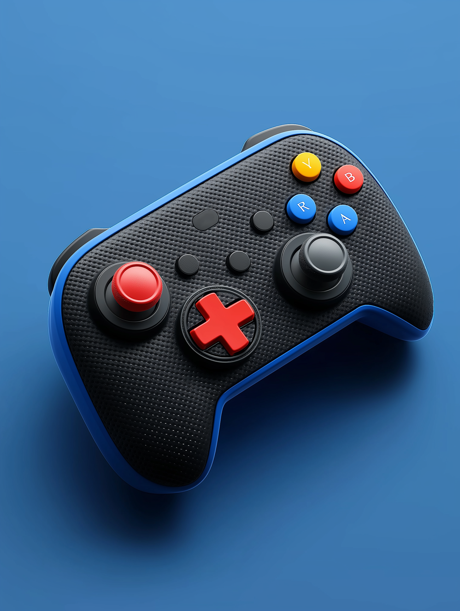 Sleek gaming controller with vibrant buttons and textured grip, set against a clean blue background for a modern look.