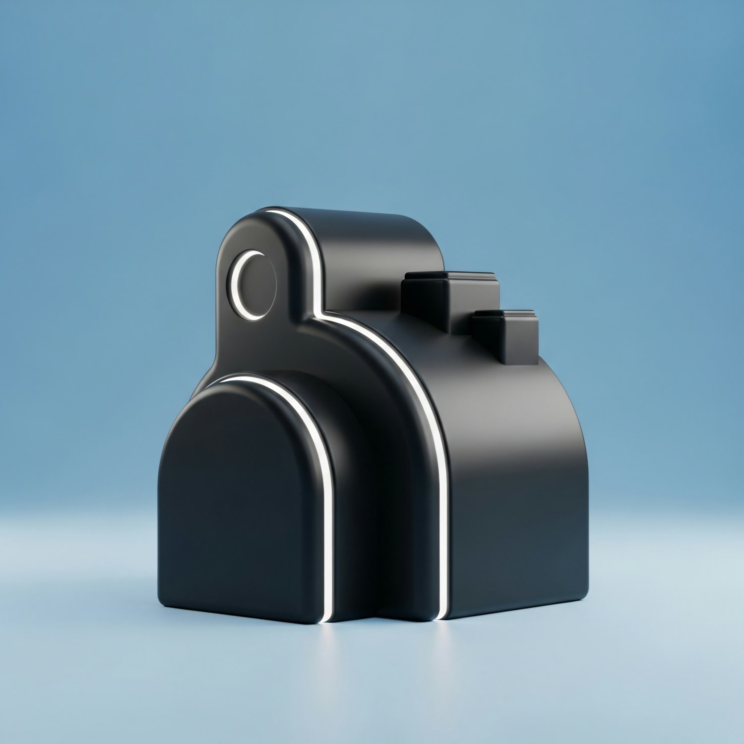 A futuristic black geometric object with glowing white accents on a gradient blue background, showcasing modern design aesthetics.