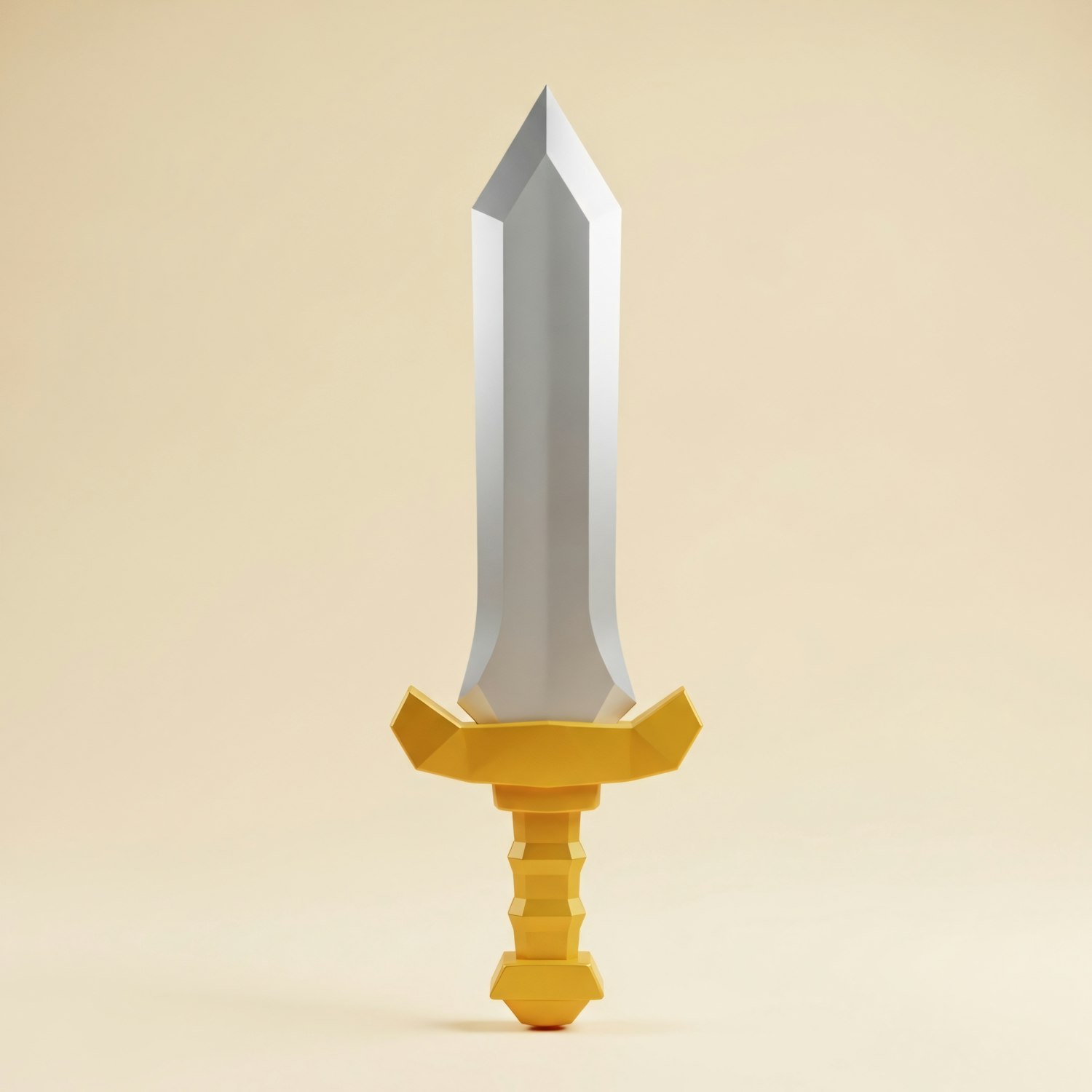 A stylized sword with a silver blade and golden hilt, featuring a geometric design, set against a neutral beige background.