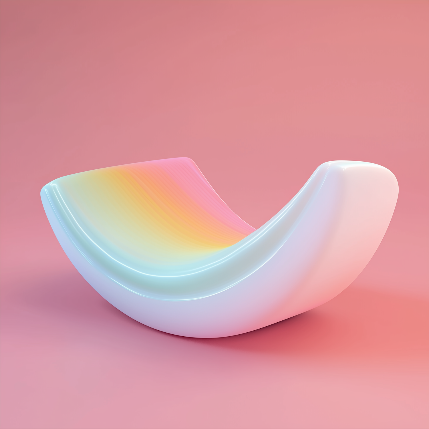 Modern curved chair with pastel gradient design on a glossy white base, set against a soft pink background. Sleek and artistic.