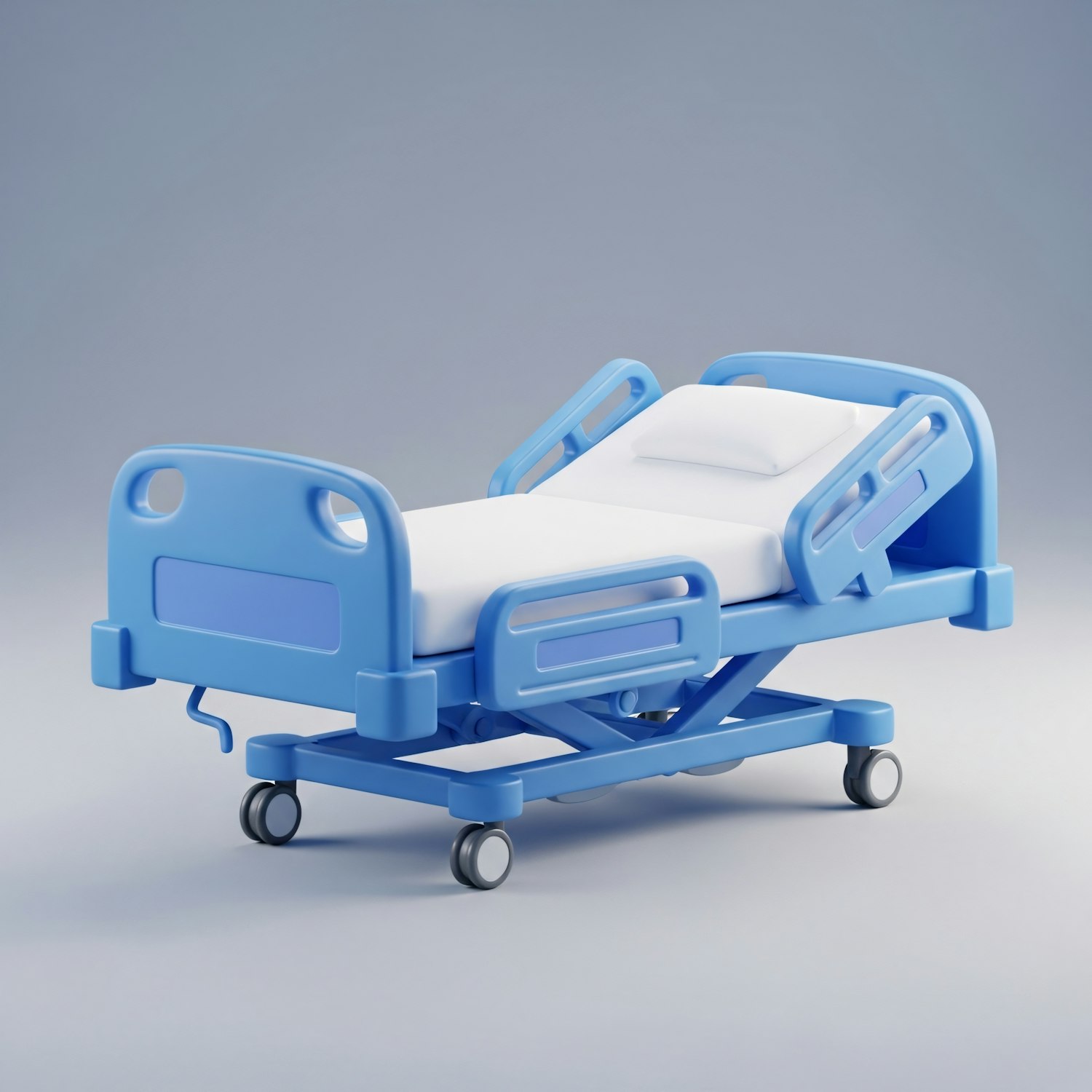 A modern hospital bed with a blue frame and white mattress, featuring adjustable rails and wheels, set against a neutral background.