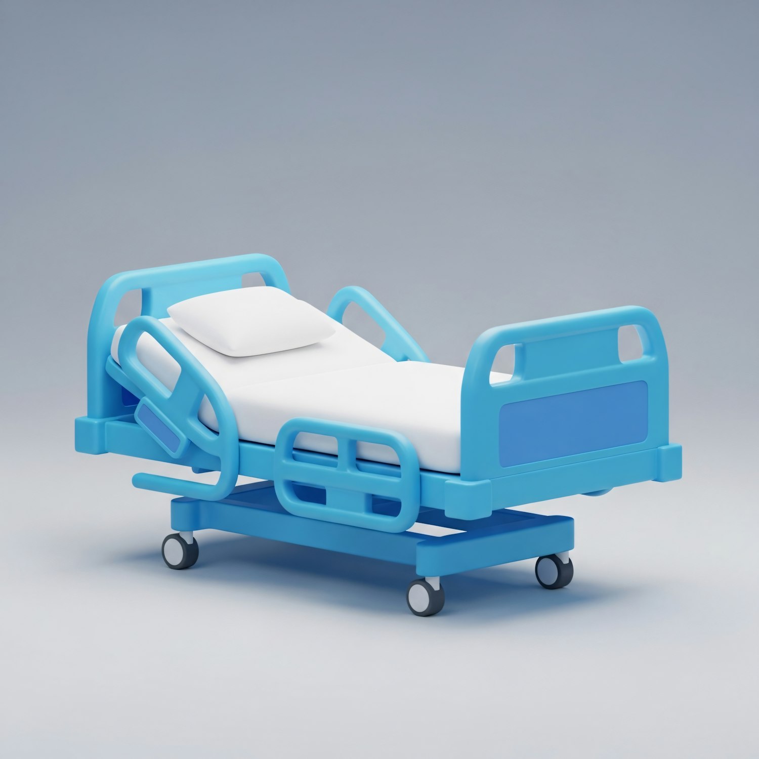 A modern hospital bed with a blue frame and white mattress, designed for mobility and comfort, set against a light blue background.