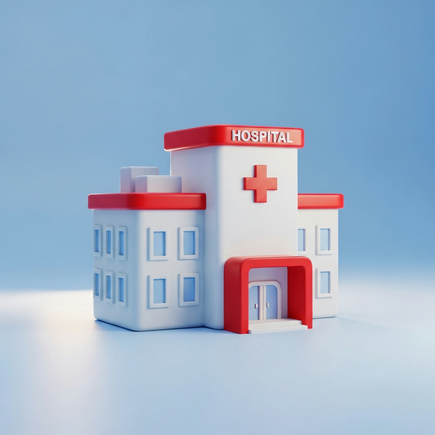 A clean 3D illustration of a hospital building with white walls, red accents, and a blue background, symbolizing healthcare and safety.