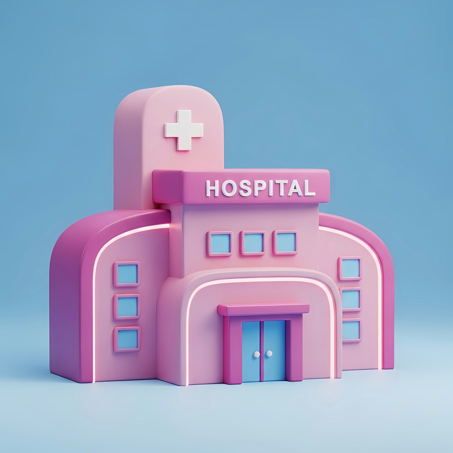 A vibrant 3D illustration of a hospital building in pink and purple tones, with a modern design and a blue background.