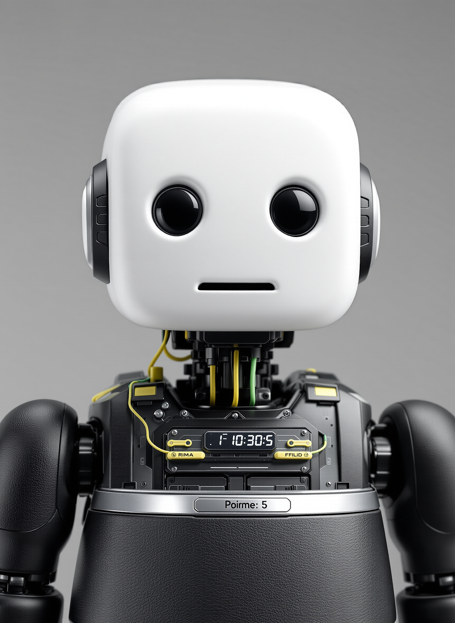 A sleek humanoid robot with a white head, black eyes, and a digital display on its chest, showcasing a modern and functional design.
