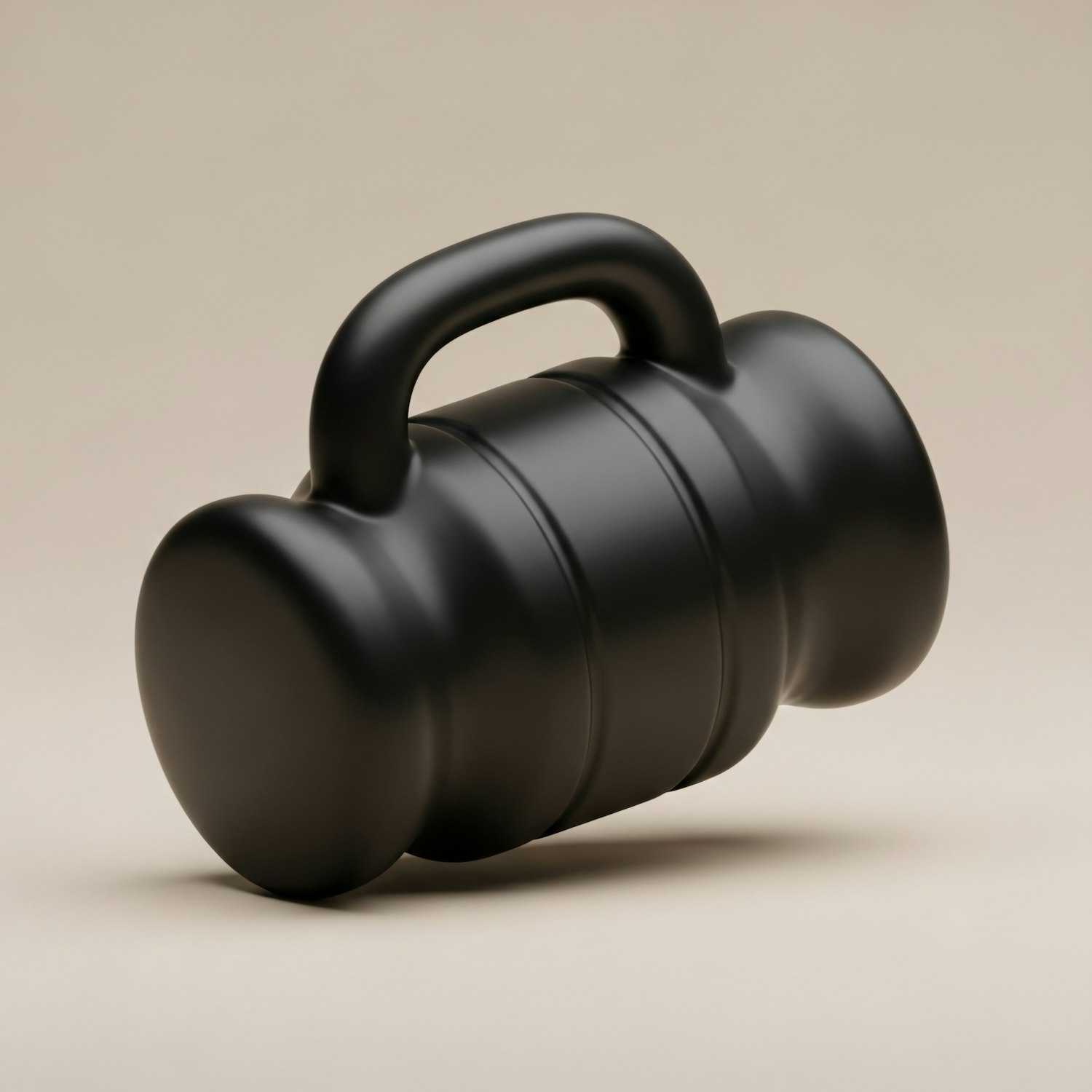 A modern matte black kettlebell-like object with a cylindrical design, set against a neutral beige background.