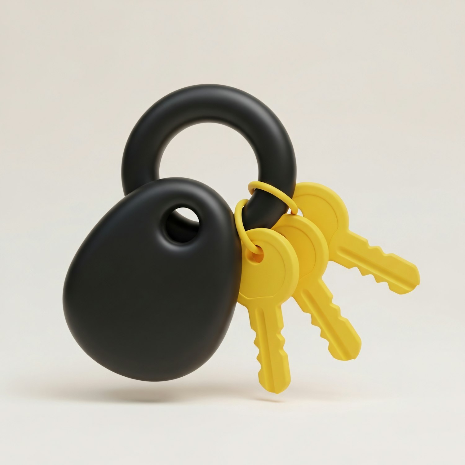 A sleek 3D rendering of a black key fob with three yellow keys on a neutral background, showcasing modern and minimalistic design.