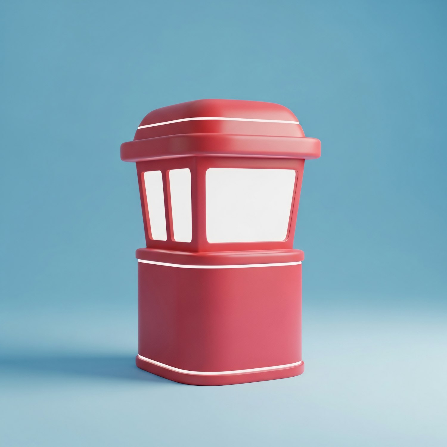 A vibrant 3D model of a red and white glowing booth against a blue background, showcasing a modern and minimalistic design.