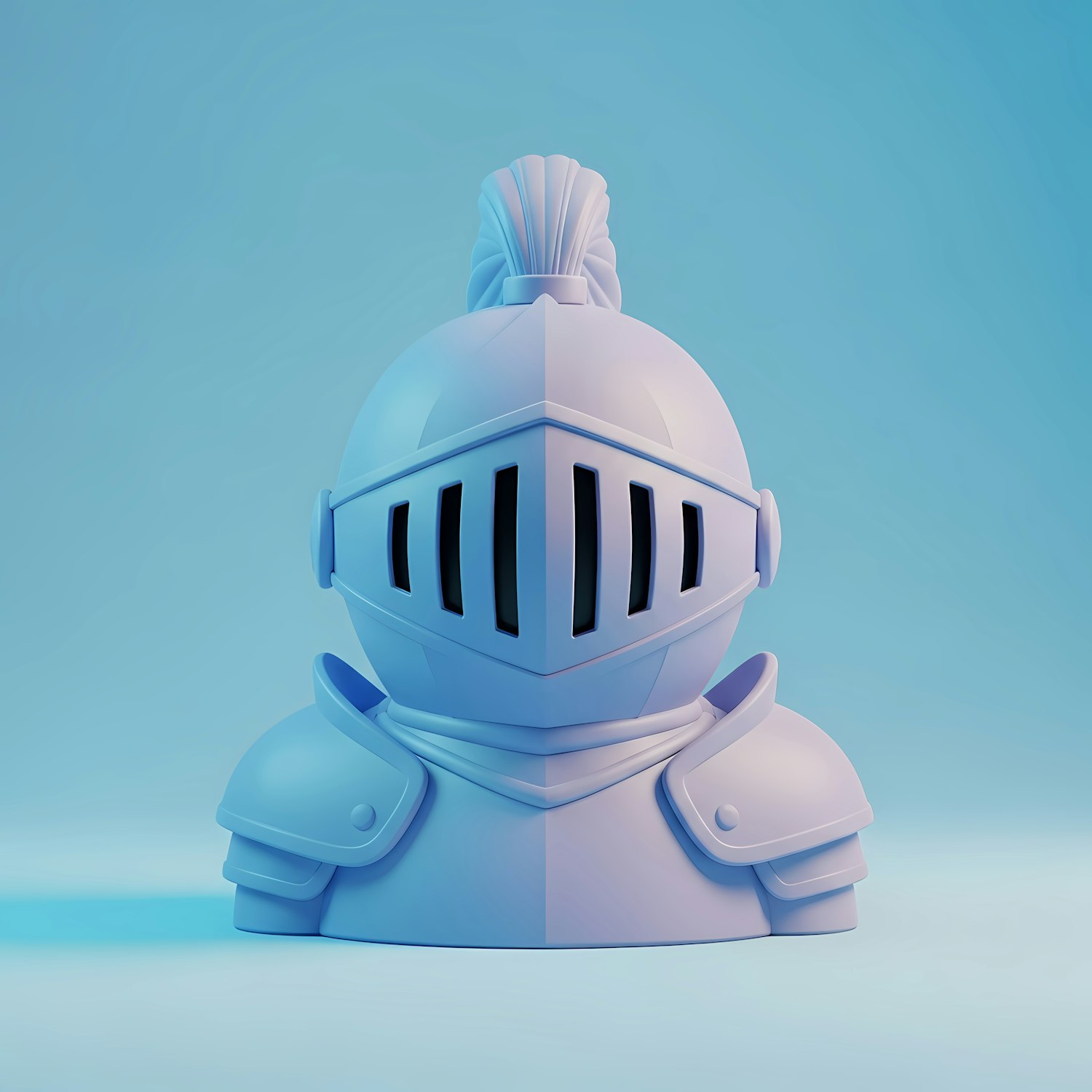 Minimalist 3D rendering of a knight's helmet and armor in light blue tones, set against a clean blue gradient background.