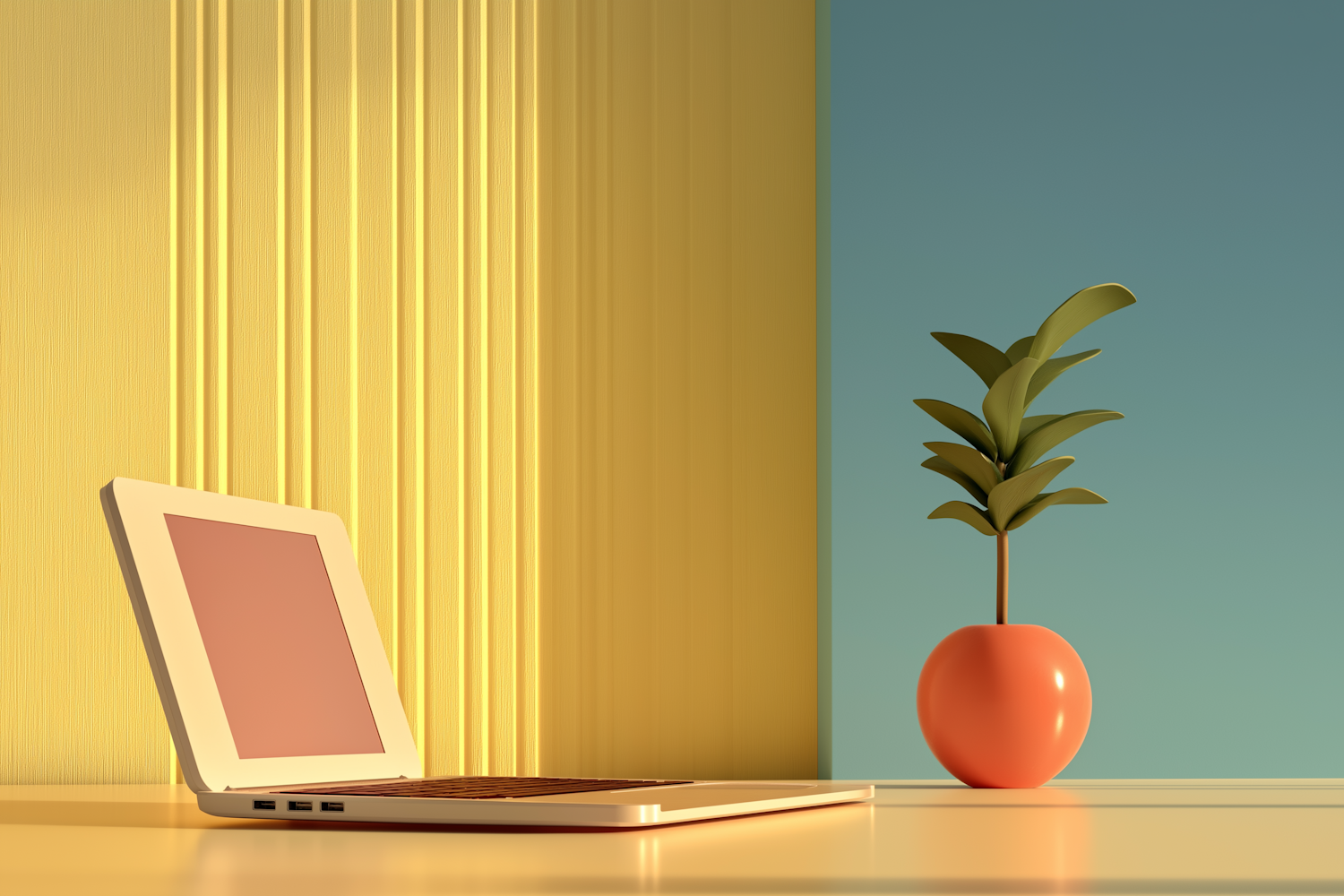 Minimalist workspace with a beige laptop and a vibrant orange potted plant against a yellow and teal background.