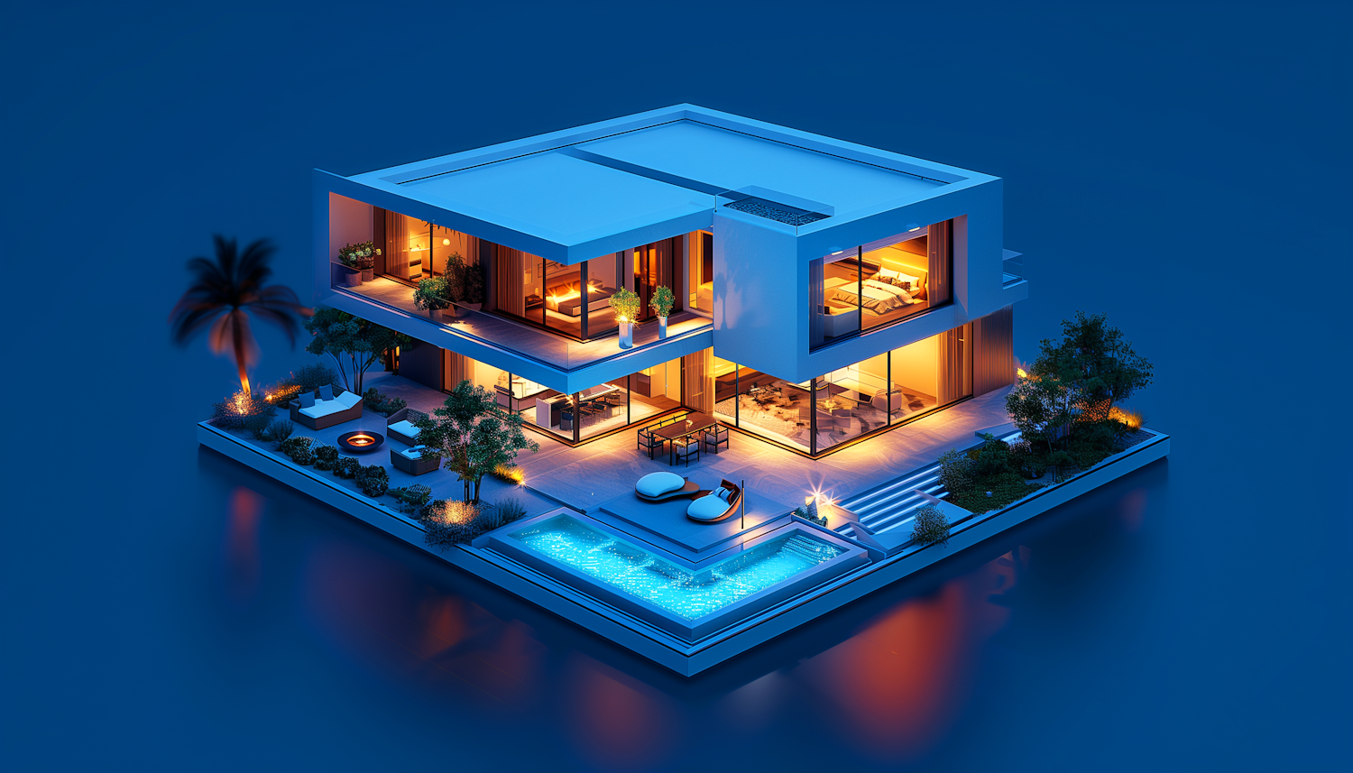 Luxurious modern house with glowing interiors, large glass windows, and a serene pool, set against a deep blue background.