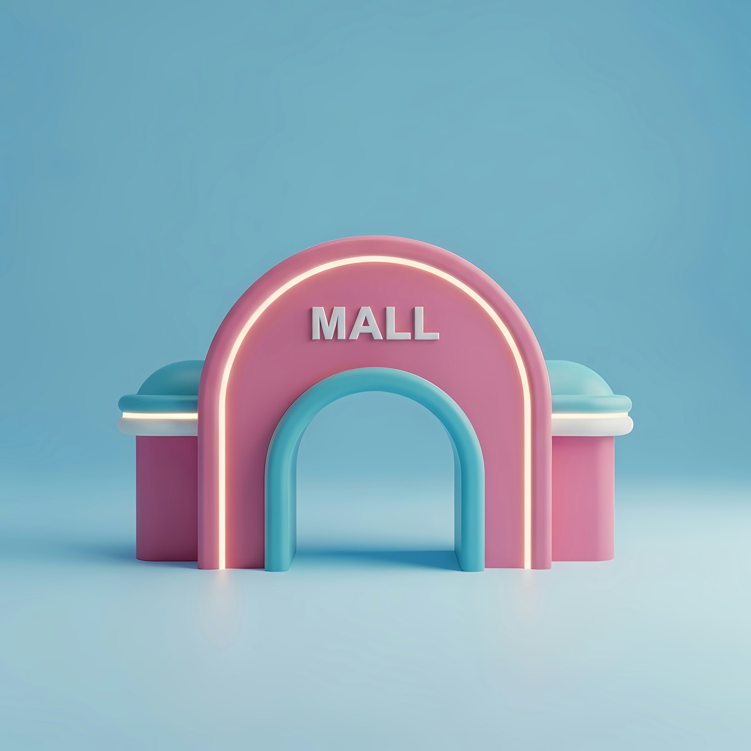 A minimalistic 3D illustration of a mall entrance in pink and blue tones, with a clean and modern design against a light blue background.