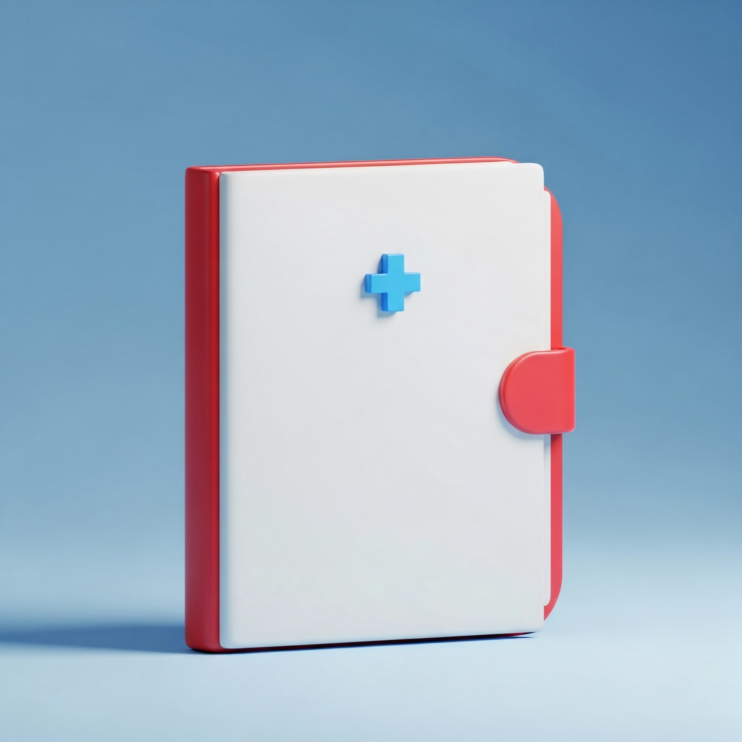 Minimalistic design of a white and red medical-themed object with a blue cross, set against a clean blue background.