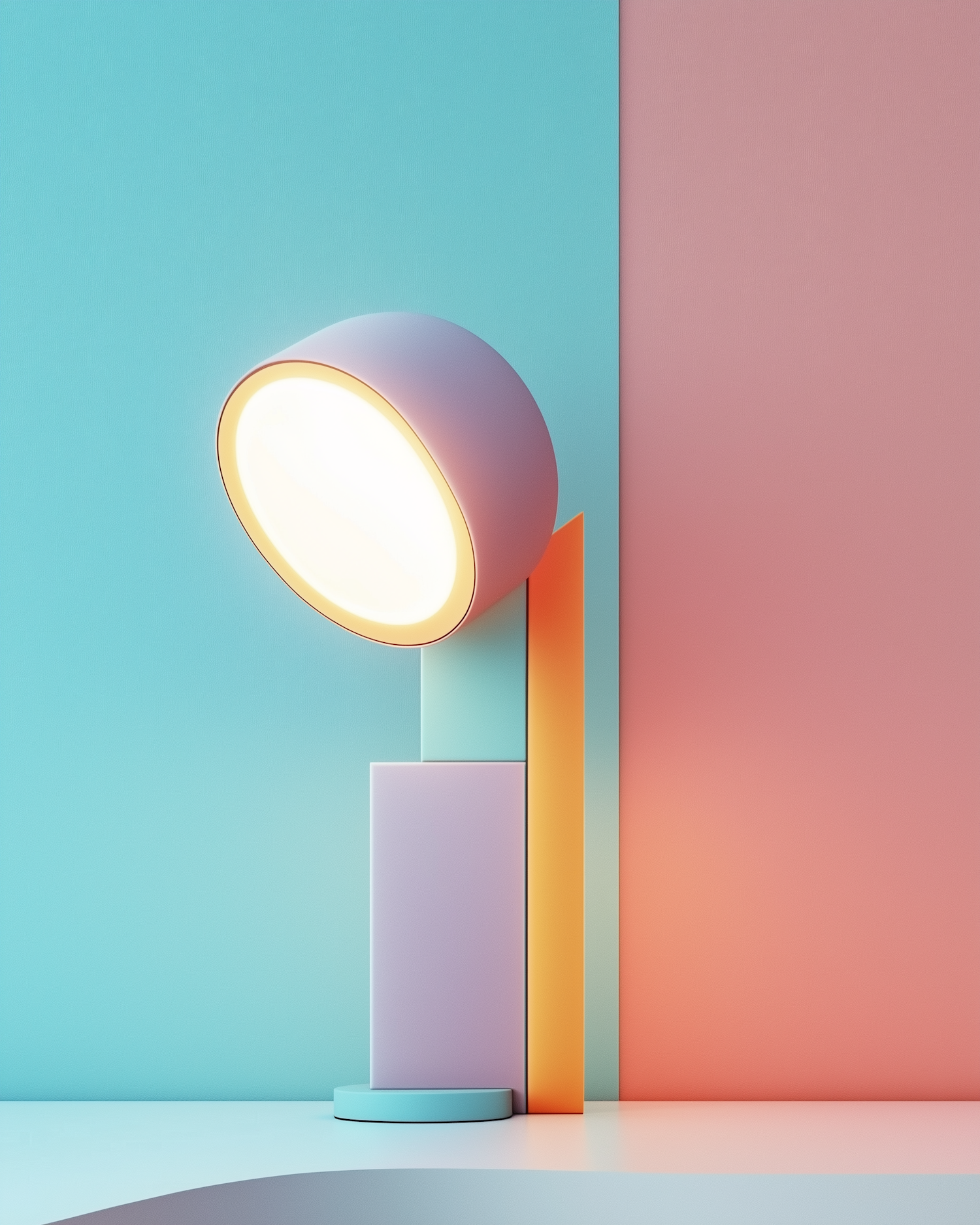 Minimalist pastel table lamp glowing warmly against a vibrant turquoise and pink color-blocked background. Modern and artistic design.