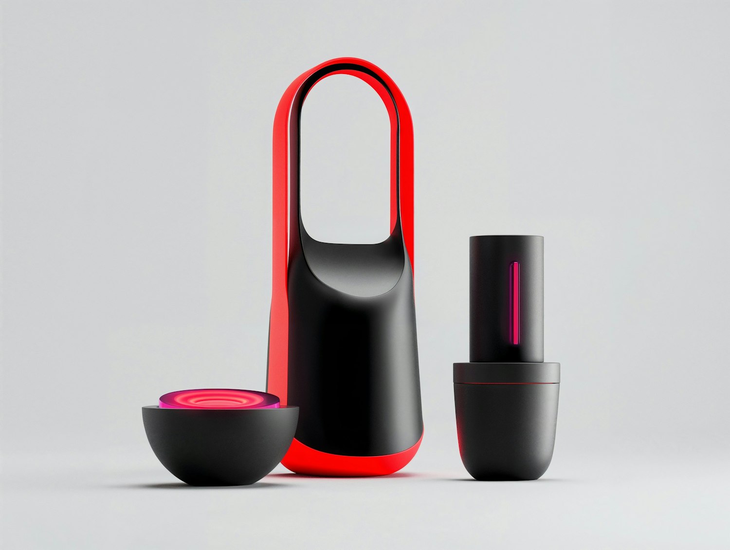 Futuristic black and red design with a looped handle, spherical and cylindrical objects, featuring vibrant pink accents.