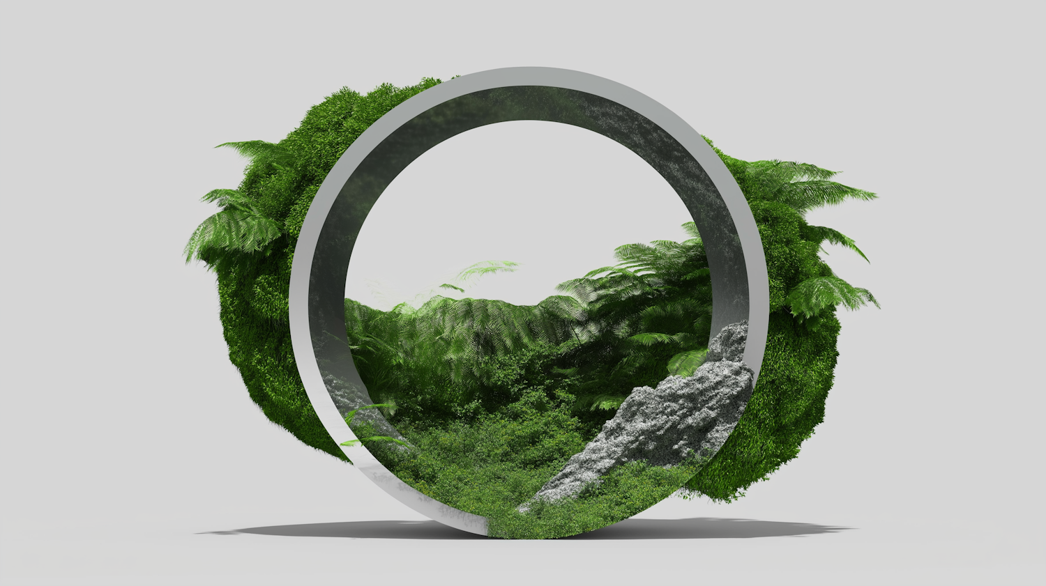 A circular metallic frame encloses a vibrant green natural scene with ferns and moss, blending modern design with organic elements.